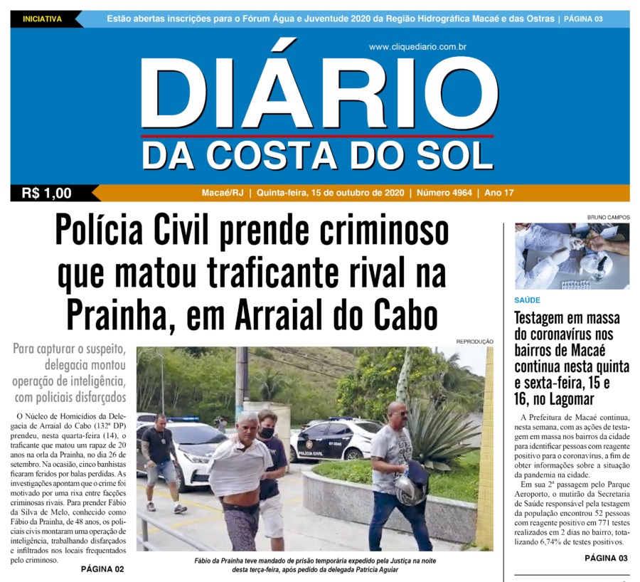 Edições Impressas Edição de quinta-feira 15/10/2020 nº 4964 Publicado em 15/10/2020 - 04:11 Escrito por Fernando Vitor Notícias relacionadas:destaque Seguinte Edição de sexta-feira 16/10/2020 nº 4965 Anterior Edição de quarta-feira 14/10/2020 nº 4963 Fernando Vitor Notícias Recentes Política51 minutos atrás TCE-RJ destaca equilíbrio financeiro e aprova contas da Prefeitura de Macaé referentes a 2024 Cabo Frio6 horas atrás Cabo Frio: Caso Alexu Rosa reacende debate sobre violência doméstica e impunidade Arraial do cabo6 horas atrás ONU escolhe Arraial do Cabo para sediar evento mundial voltado ao meio ambiente Esporte6 horas atrás Escola de Vela de Rio das Ostras tem 5 alunos selecionados para o Campeonato Brasileiro Cidades7 horas atrás Macaé recebe 2ª Feira de Cordel e Cultura Nordestina neste sábado (8) Cidades7 horas atrás Macaé se destaca em fórum regional e reforça protagonismo na educação inclusiva Meio Ambiente7 horas atrás Programa do governo estadual promove limpeza de rio no Âncora, em Rio das Ostras Cabo Frio7 horas atrás Prefeitura de Cabo Frio participa de discussão sobre novas normas para reciclagem e reaproveitamento de materiais Polícia7 horas atrás Homem é preso em Campos após agredir a própria filha de 14 anos Cabo Frio7 horas atrás Acordo entre Prefeitura de Cabo Frio e Estado dá novo ritmo ao trabalho da 126ª DP Clique Diário E. L. Mídia Editora Ltda CNPJ: 09.298.880/0001-07 Redação: Rua Tupinambás 122 Gloria – Macaé/RJ comercial@diariocs.com (22) 2765-7353 (22) 999253130 Mais lidas da semana Mobilidade5 dias atrás Rio das Ostras intensifica ações de combate a irregularidades no trânsito Cidades1 dia atrás HFM ganha novo Pronto-Socorro moderno e ampliado em Campos Educação6 dias atrás Cerimônia no Teatro fecha o 2º Prêmio Literário do Ensino Fundamental de Rio das Ostras Cabo Frio6 dias atrás Cabo Frio amplia medidas de preservação com novas placas e plantio de espécies nativas