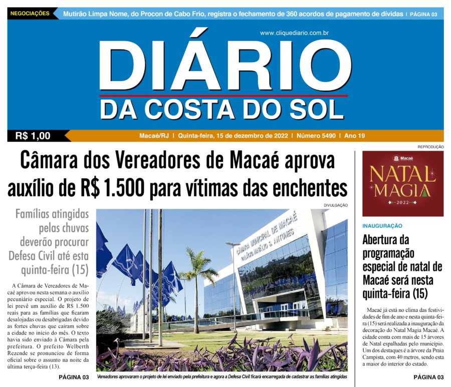 Edições Impressas Edição de quinta-feira 15/12/2022 nº 5490 Publicado em 15/12/2022 - 06:23 Escrito por Redação Notícias relacionadas: Seguinte Edição de sexta-feira 16/12/2022 nº 5491 Anterior Edição de quarta-feira 14/12/2022 nº 5489 Redação Notícias Recentes Edições Impressas5 horas atrás Edição de sábado a segunda-feira 22 a 24/11/2025 nº 6217 Cultura6 horas atrás Espetáculo de dança se apresenta nesse sábado, 22, no Teatro de Rio das Ostras São Pedro da Aldeia6 horas atrás São Pedro da Aldeia movimenta praças e equipamentos culturais Cabo Frio7 horas atrás Cabo Frio impulsiona negócios locais com a Feira + Forte Cidades7 horas atrás Orla da Imbetiba recebe Feira Multicultural “Afro Macaé” neste sábado Cultura23 horas atrás Festa do Feijão começa nessa sexta-feira, 21, em Cantagalo, em Rio das Ostras Cidades23 horas atrás Quissamã celebra Consciência Negra com atividades culturais em escolas municipais Polícia24 horas atrás Mulher é presa em Campos acusada de maus-tratos contra a própria filha Arraial do cabo24 horas atrás Arraial do Cabo destaca cultura negra com apresentação de Luciana Mello e Mart’nália Arraial do cabo1 dia atrás Arraial do Cabo inicia checagem obrigatória de veículos de passeio Clique Diário E. L. Mídia Editora Ltda CNPJ: 09.298.880/0001-07 Redação: Rua Tupinambás 122 Gloria – Macaé/RJ comercial@diariocs.com (22) 2765-7353 (22) 999253130 Mais lidas da semana Desenvolvimento3 dias atrás Rio das Ostras estreita relações com a Rede Petro BC de olho em eventos do setor de energia em 2026 Cabo Frio2 dias atrás Cabo Frio promove ação do projeto Capoeiragem para registro de documentário Cultura3 dias atrás Moda e Prosa Caipira tem sua 6ª edição nessa quinta, 20, em Saquarema Cidades3 dias atrás Caravana de Natal Coca-Cola passa por Rio das Ostras e Casimiro de Abreu nessa quinta, 20