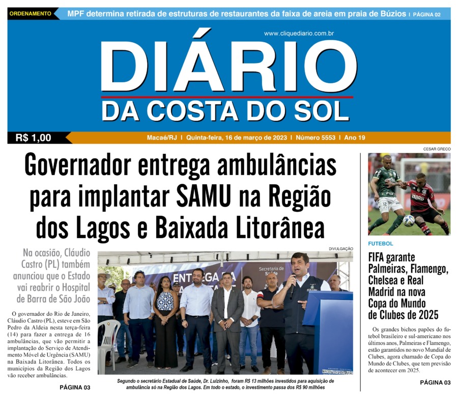 Edições Impressas Edição de quinta-feira 16/03/2023 nº 5553 Publicado em 15/03/2023 - 23:55 Escrito por Redação Notícias relacionadas: Seguinte Edição de sexta-feira 17/03/2023 nº 5554 Anterior Edição de quarta-feira 15/03/2023 nº 5552 Redação Notícias Recentes Cabo Frio8 minutos atrás Prefeitura de Cabo Frio prepara espaço para visitação no Dia de Finados Polícia9 minutos atrás Dois homens são presos após furto a residência em Campos Cabo Frio13 minutos atrás Câmara de Cabo Frio recebe debate sobre finanças municipais Cabo Frio18 minutos atrás Projeto Mar Sem Lixo promove mostra ambiental com apoio da Secretaria de Meio Ambiente em Cabo Frio Saúde1 hora atrás Caminhada do Outubro Rosa reúne mais de 600 idosos em Maricá nessa sexta, 24 Cultura2 horas atrás Teatro de Rio das Ostras tem fim de semana com 2 espetáculos locais Cabo Frio2 horas atrás Cabo Frio realiza evento de saúde e bem-estar no Outubro Rosa Cabo Frio2 horas atrás Especialistas discutem entrega legal e proteção à infância em Cabo Frio Greve5 horas atrás TJRJ considera greve do Sepe irregular e determina retomada imediata das aulas em Rio das Ostras Cidadania5 horas atrás Plano Diretor de Rio das Ostras é tema de fórum da sociedade civil nesse sábado, 25 Clique Diário E. L. Mídia Editora Ltda CNPJ: 09.298.880/0001-07 Redação: Rua Tupinambás 122 Gloria – Macaé/RJ comercial@diariocs.com (22) 2765-7353 (22) 999253130 Mais lidas da semana Cultura4 dias atrás Silva Jardim anuncia shows gratuitos de samba e pagode para o fim de semana Polícia4 dias atrás Policiais da PRF salvam bebê engasgado na BR-101, em Campos Cabo Frio4 dias atrás Atletas de várias cidades se enfrentam em competição de Muay Thai em Cabo Frio Cabo Frio4 dias atrás Serviços essenciais permanecem ativos durante ponto facultativo em Cabo Frio