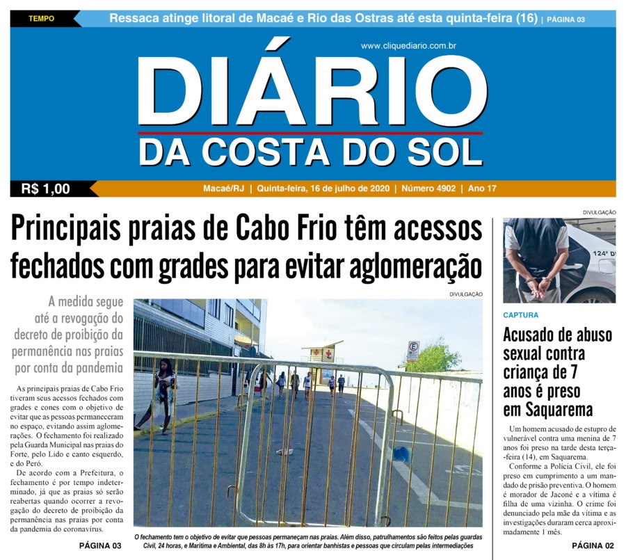 Edições Impressas Edição de quinta-feira 16/07/2020 nº 4902 Publicado em 16/07/2020 - 05:00 Escrito por Fernando Vitor Notícias relacionadas:destaque Seguinte Edição de sexta-feira 17/07/2020 nº 4903 Anterior Edição de quarta-feira 15/07/2020 nº 4901 Fernando Vitor Notícias Recentes Cabo Frio15 horas atrás Arte e solidariedade marcam a 1ª Mostra de Dança Regional de Tamoios Cidades21 horas atrás Região serrana de Macaé recebe 1º X-Force Passeio de Quadriciclo e Aranha neste domingo (26) Polícia21 horas atrás Polícia apreende mais de meio quilo de drogas no Loteamento São João, em Rio das Ostras Saúde2 dias atrás Eventos esportivo e cultural reforça campanha do Outubro Rosa em Rio das Ostras nesse domingo, 26 Edições Impressas2 dias atrás Sábado a segunda-feira 25 a 27/10/2025 nº 6197 Cidades2 dias atrás Shopping Plaza Macaé oferece programação gratuita com feira de adoção e show de pagode neste fim de semana Cidades3 dias atrás 32º BPM completa 23 anos com solenidade de celebração e reconhecimento aos policiais Armação dos Búzios3 dias atrás Búzios celebra esporte e superação com XC RUN 2025 Araruama3 dias atrás Araruama promove saúde, lazer e cidadania em evento comunitário Arraial do cabo3 dias atrás Educação e sustentabilidade se encontram para jovens de Arraial do Cabo Clique Diário E. L. Mídia Editora Ltda CNPJ: 09.298.880/0001-07 Redação: Rua Tupinambás 122 Gloria – Macaé/RJ comercial@diariocs.com (22) 2765-7353 (22) 999253130 Mais lidas da semana Cultura7 dias atrás Silva Jardim anuncia shows gratuitos de samba e pagode para o fim de semana Cultura6 dias atrás Música, emoção e cores: Rodrigo Pontes apresenta show especial em Rio das Ostras Cabo Frio6 dias atrás Atletas de várias cidades se enfrentam em competição de Muay Thai em Cabo Frio Cabo Frio6 dias atrás Serviços essenciais permanecem ativos durante ponto facultativo em Cabo Frio