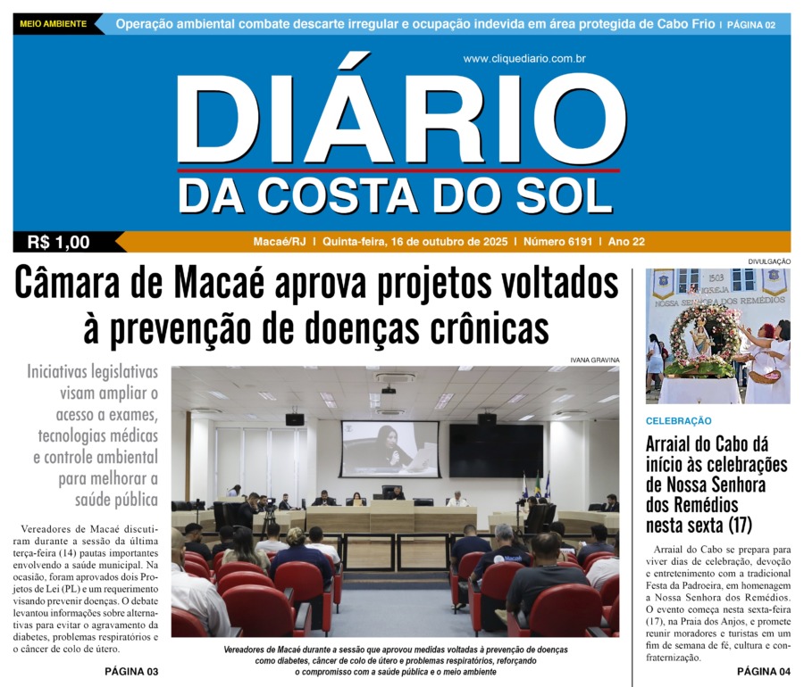 Edições Impressas Edição de quinta-feira 16/10/2025 n° 6191 Publicado em 16/10/2025 - 08:46 Escrito por Redação Notícias relacionadas: Seguinte Edição de sexta-feira 17/10/2025 nº 6192 Anterior Edição de quarta-feira 15/10/2025 nº 6190 Redação Notícias Recentes Cabo Frio3 horas atrás Estudantes de Cabo Frio brilham em premiação do projeto CaptaAção Armação dos Búzios8 horas atrás Búzios Swim celebra esporte, natureza e turismo na Região dos Lagos Cabo Frio9 horas atrás Educação pública de Cabo Frio colhe frutos com conquistas em competições científicas Edições Impressas10 horas atrás Edição de sábado a segunda-feira 08 a 10/11/2025 nº 6208 Polícia10 horas atrás Moto sem placa é abandonada após fuga de suspeito em Macaé Polícia11 horas atrás Polícia Civil prende homem em flagrante por tráfico de drogas no Parque Aeroporto, em Macaé Iguaba1 dia atrás Menina de Iguaba Grande realiza sonho e conhece o príncipe William no Rio de Janeiro Arraial do cabo1 dia atrás Arraial do Cabo é exemplo de tranquilidade na Região dos Lagos, segundo dados do ISP Arraial do cabo1 dia atrás Festival em Arraial do Cabo promete recorde de público com mais de 15 mil pratos e 10 mil litros de chope Arraial do cabo1 dia atrás Oficina une saúde, cidadania e acolhimento em Arraial do Cabo Clique Diário E. L. Mídia Editora Ltda CNPJ: 09.298.880/0001-07 Redação: Rua Tupinambás 122 Gloria – Macaé/RJ comercial@diariocs.com (22) 2765-7353 (22) 999253130 Mais lidas da semana Arraial do cabo2 dias atrás Arraial do Cabo celebra 3ª edição do Festival de Frutos do Mar com entrada livre; Carol Biazin, Ramona Rox, Liah Soares e mais Turismo5 dias atrás Saquarema celebra reconhecimento de projeto pelo Ministério do Turismo Educação4 dias atrás Estudantes de Rio das Ostras são destaques em evento nacional da Educação Cidades4 dias atrás HFM ganha novo Pronto-Socorro moderno e ampliado em Campos