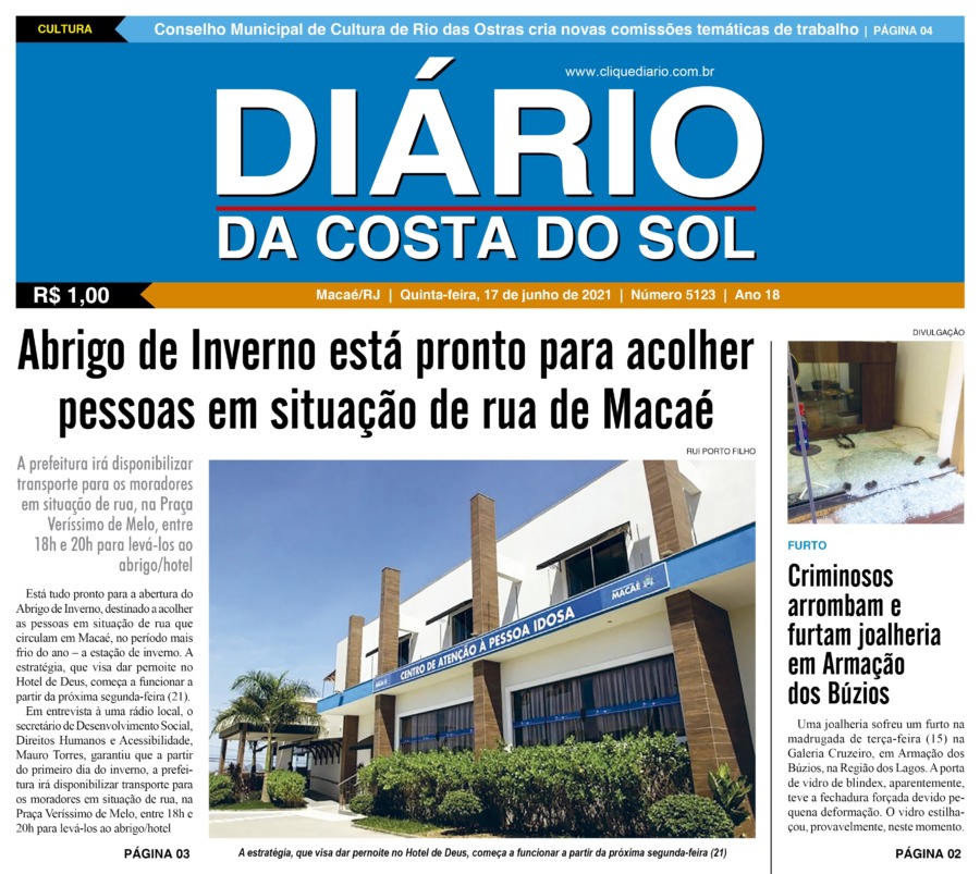 Edições Impressas Edição de quinta-feira 17/06/2021 nº 5123 Publicado em 17/06/2021 - 00:00 Escrito por Fernando Vitor Notícias relacionadas:destaque Seguinte Edição de sexta-feira 18/06/2021 n° 5124 Anterior Edição de quarta-feira 16/06/2021 nº 5122 Fernando Vitor Notícias Recentes Cultura4 horas atrás Teatro de Rio das Ostras recebe 2 espetáculos de dança nesse fim de semana Arraial do cabo4 horas atrás FIPAC oferece serviços de saúde e prevenção ao câncer de próstata em Arraial do Cabo Arraial do cabo4 horas atrás Resultado preliminar do concurso de Arraial já está no ar pelo IBAM Edições Impressas4 horas atrás Edição de sábado a segunda-feira 15 a 17/11/2025 nº 6213 Cidades6 horas atrás Shopping Plaza Macaé inicia programação de Natal neste fim de semana Cabo Frio6 horas atrás Disputa em dobro marca encerramento em Cabo Frio do circuito de surf Cabo Frio22 horas atrás Agentes de Cabo Frio recebem novo treinamento técnico para atuar em casos de poluição sonora Cabo Frio22 horas atrás Homem procurado por latrocínio é detido por agentes em Cabo Frio Cabo Frio22 horas atrás Representante da Guarda Civil de Cabo Frio compete na etapa final ao lado de jovens atletas Polícia22 horas atrás Prefeito de Rio das Ostras volta de Brasília com esperança de novos investimentos Clique Diário E. L. Mídia Editora Ltda CNPJ: 09.298.880/0001-07 Redação: Rua Tupinambás 122 Gloria – Macaé/RJ comercial@diariocs.com (22) 2765-7353 (22) 999253130 Mais lidas da semana Cultura1 dia atrás Adilson Lopes apresenta exposição “Trajetória” em Casimiro de Abreu Cidades4 dias atrás Servidores de Rio das Ostras participam de treinamento do Estado em Búzios Polícia3 dias atrás Farmácia é interditada e uma pessoa é presa em Rio das Ostras em operação da Polícia Federal Esporte23 horas atrás De Saquarema para o Brasileirão: Vasco troca gramado de São Januário