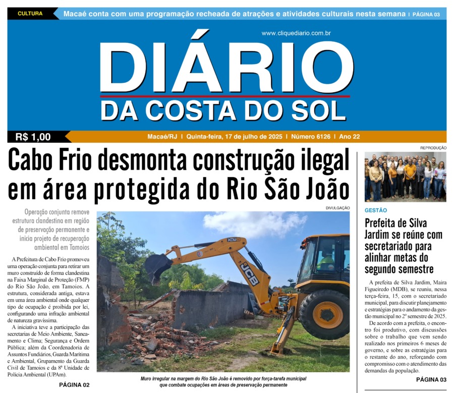 Edições Impressas Edição de quinta-feira 17/07/2025 nº 6126 Publicado em 17/07/2025 - 09:32 Escrito por Redação Notícias relacionadas: Seguinte Edição de sexta-feira 18/07/2025 nº 6127 Anterior Edição de quarta-feira 16/07/2025 nº 6125 Redação Notícias Recentes Polícia3 minutos atrás Polícia apreende mais de 10 mil reais em bebidas sem nota fiscal em Rio das Ostras Arraial do cabo19 minutos atrás Ação conjunta entre CPROEIS e PATAMO prende suspeito com drogas em Arraial do Cabo Sem categoria2 horas atrás Atleta do Cabo Frio + Esporte é destaque na Corrida do Guardião Cidades3 horas atrás Mulheres de Saquarema participam de atividade lúdica sobre autoconhecimento Diversão4 horas atrás Silva Jardim celebra o Mês das Crianças com mais uma atividade no Centro Polícia4 horas atrás Polícia descobre esconderijo do tráfico e apreende grande quantidade de drogas em Macaé Polícia4 horas atrás Homem é preso com 105 cápsulas de cocaína em localidade de Rio das Ostras Polícia4 horas atrás Criminoso foge após perseguição e drogas são apreendidas em Macaé Polícia4 horas atrás Traficante é preso em Macaé após perseguição policial no Parque Aeroporto Polícia4 horas atrás Polícia prende suspeito e recupera carro roubado de madrugada em Rio das Ostras Clique Diário E. L. Mídia Editora Ltda CNPJ: 09.298.880/0001-07 Redação: Rua Tupinambás 122 Gloria – Macaé/RJ comercial@diariocs.com (22) 2765-7353 (22) 999253130 Mais lidas da semana Cultura7 dias atrás Silva Jardim anuncia shows gratuitos de samba e pagode para o fim de semana Cultura6 dias atrás Música, emoção e cores: Rodrigo Pontes apresenta show especial em Rio das Ostras Edições Impressas5 dias atrás Edição de quarta-feira 22/10/2025 nº 6195 Arraial do cabo7 dias atrás Prisão em flagrante marca operação da Patrulha Maria da Penha em Arraial do Cabo