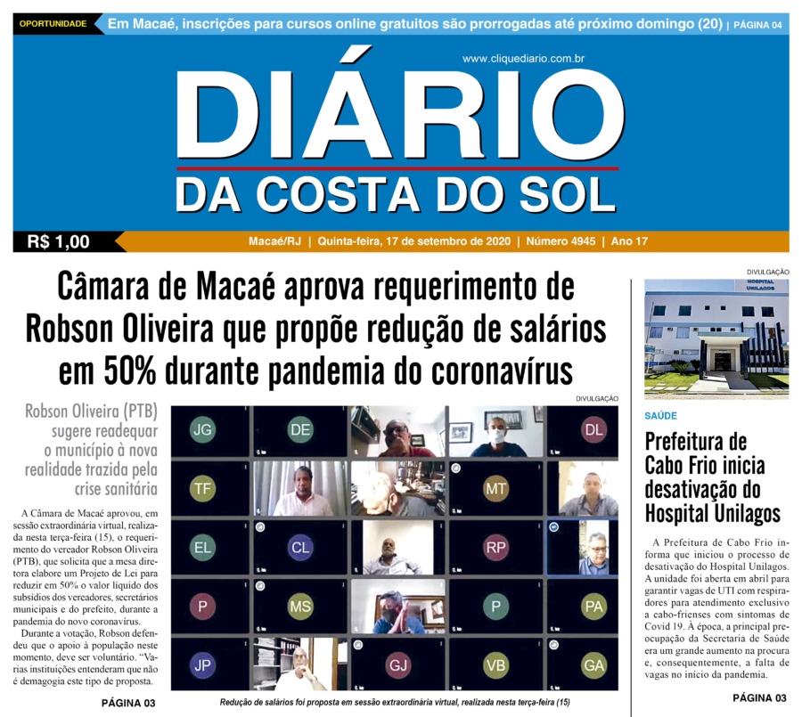 Edições Impressas Edição de quinta-feira 17/09/2020 nº 4945 Publicado em 17/09/2020 - 05:00 Escrito por Fernando Vitor Notícias relacionadas:destaque Seguinte Edição de sexta-feira 18/09/2020 nº 4946 Anterior Edição de quarta-feira 16/09/2020 nº 4944 Fernando Vitor Notícias Recentes Cabo Frio7 horas atrás Arte e solidariedade marcam a 1ª Mostra de Dança Regional de Tamoios Cidades12 horas atrás Região serrana de Macaé recebe 1º X-Force Passeio de Quadriciclo e Aranha neste domingo (26) Polícia12 horas atrás Polícia apreende mais de meio quilo de drogas no Loteamento São João, em Rio das Ostras Saúde1 dia atrás Eventos esportivo e cultural reforça campanha do Outubro Rosa em Rio das Ostras nesse domingo, 26 Edições Impressas1 dia atrás Sábado a segunda-feira 25 a 27/10/2025 nº 6197 Cidades2 dias atrás Shopping Plaza Macaé oferece programação gratuita com feira de adoção e show de pagode neste fim de semana Cidades2 dias atrás 32º BPM completa 23 anos com solenidade de celebração e reconhecimento aos policiais Armação dos Búzios2 dias atrás Búzios celebra esporte e superação com XC RUN 2025 Araruama2 dias atrás Araruama promove saúde, lazer e cidadania em evento comunitário Arraial do cabo2 dias atrás Educação e sustentabilidade se encontram para jovens de Arraial do Cabo Clique Diário E. L. Mídia Editora Ltda CNPJ: 09.298.880/0001-07 Redação: Rua Tupinambás 122 Gloria – Macaé/RJ comercial@diariocs.com (22) 2765-7353 (22) 999253130 Mais lidas da semana Cultura6 dias atrás Silva Jardim anuncia shows gratuitos de samba e pagode para o fim de semana Cultura5 dias atrás Música, emoção e cores: Rodrigo Pontes apresenta show especial em Rio das Ostras Cabo Frio6 dias atrás Atletas de várias cidades se enfrentam em competição de Muay Thai em Cabo Frio Cabo Frio6 dias atrás Serviços essenciais permanecem ativos durante ponto facultativo em Cabo Frio