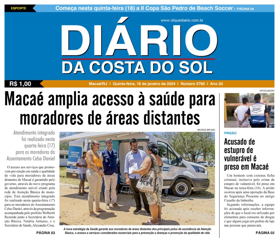Edições Impressas Edição de quinta-feira 18/01/2024 nº 5760 Publicado em 18/01/2024 - 00:48 Escrito por Redação Notícias relacionadas: Seguinte Edição de sexta-feira 19/01/2024 nº 5761 Anterior Edição de quarta-feira 17/01/2024 nº 5759 Redação Notícias Recentes Cabo Frio14 horas atrás Cabo Frio antecipa a Black Friday com grandes marcas e atrações musicais Cidades17 horas atrás Procon de Rio das Ostras investiga denúncias de cobrança dupla na Enel Cidades19 horas atrás Macaé sediará o 8º Encontro Fluminense de Arborização Urbana em dezembro Cultura2 dias atrás Teatro de Rio das Ostras recebe 2 espetáculos de dança nesse fim de semana Arraial do cabo2 dias atrás FIPAC oferece serviços de saúde e prevenção ao câncer de próstata em Arraial do Cabo Arraial do cabo2 dias atrás Resultado preliminar do concurso de Arraial já está no ar pelo IBAM Edições Impressas2 dias atrás Edição de sábado a segunda-feira 15 a 17/11/2025 nº 6213 Cidades2 dias atrás Shopping Plaza Macaé inicia programação de Natal neste fim de semana Cabo Frio2 dias atrás Disputa em dobro marca encerramento em Cabo Frio do circuito de surf Cabo Frio2 dias atrás Agentes de Cabo Frio recebem novo treinamento técnico para atuar em casos de poluição sonora Clique Diário E. L. Mídia Editora Ltda CNPJ: 09.298.880/0001-07 Redação: Rua Tupinambás 122 Gloria – Macaé/RJ comercial@diariocs.com (22) 2765-7353 (22) 999253130 Mais lidas da semana Cultura3 dias atrás Adilson Lopes apresenta exposição “Trajetória” em Casimiro de Abreu Cidades5 dias atrás Servidores de Rio das Ostras participam de treinamento do Estado em Búzios Polícia5 dias atrás Farmácia é interditada e uma pessoa é presa em Rio das Ostras em operação da Polícia Federal Esporte3 dias atrás De Saquarema para o Brasileirão: Vasco troca gramado de São Januário