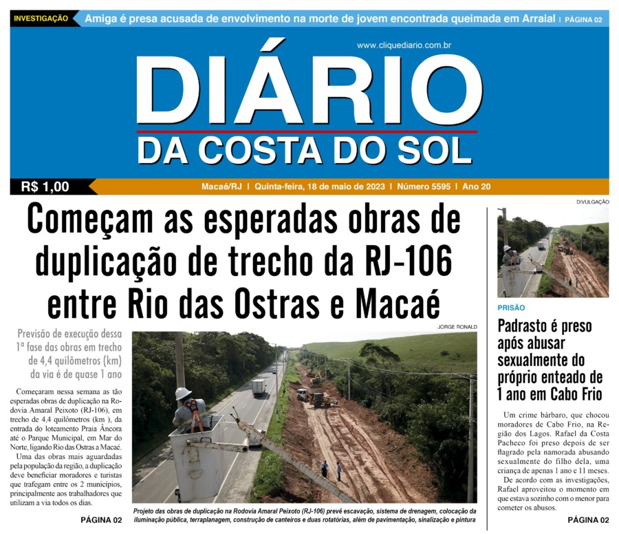 Edições Impressas Edição de quinta-feira 18/05/2023 nº 5595 Publicado em 17/05/2023 - 23:55 Escrito por Redação Notícias relacionadas: Seguinte Edição de sexta-feira 19/05/2023 nº 5596 Anterior Edição de quarta-feira 17/05/2023 nº 5594 Redação Notícias Recentes Cidades11 horas atrás Macaé realizou 5ª Corrida e Caminhada Outubro Rosa Novembro Azul na orla da Imbetiba Cidades11 horas atrás Rio das Ostras autua Rio+ por mais um caso de vazamento de esgoto na cidade Cabo Frio11 horas atrás Ação da Prefeitura e AAMA leva reflexão sobre autocuidado e prevenção do câncer de mama em Cabo Frio Cidades11 horas atrás Casa do Servidor em Macaé ultrapassa 7 mil atendimentos em oito meses de funcionamento Polícia11 horas atrás Foragido da Justiça é preso pela PM na BR-101 em Campos Araruama11 horas atrás Prefeitura define plano de segurança integrado para a Expo Araruama Iguaba11 horas atrás Prefeitura de Iguaba Grande prepara nova turma de aprendizes para atuação em órgãos públicos Cabo Frio11 horas atrás Mostra de Dança movimenta Cabo Frio com apresentações, solidariedade e cultura local Cabo Frio11 horas atrás Cabo Frio dá início à formação obrigatória para ambulantes das praias Polícia12 horas atrás Homem é preso com rádios transmissores em depósito de Casimiro de Abreu Clique Diário E. L. Mídia Editora Ltda CNPJ: 09.298.880/0001-07 Redação: Rua Tupinambás 122 Gloria – Macaé/RJ comercial@diariocs.com (22) 2765-7353 (22) 999253130 Mais lidas da semana Cultura7 dias atrás Música, emoção e cores: Rodrigo Pontes apresenta show especial em Rio das Ostras Edições Impressas6 dias atrás Edição de quarta-feira 22/10/2025 nº 6195 Edições Impressas5 dias atrás Edição de quinta-feira 23/10/2025 nº 6196 Cidadania4 dias atrás Plano Diretor de Rio das Ostras é tema de fórum da sociedade civil nesse sábado, 25