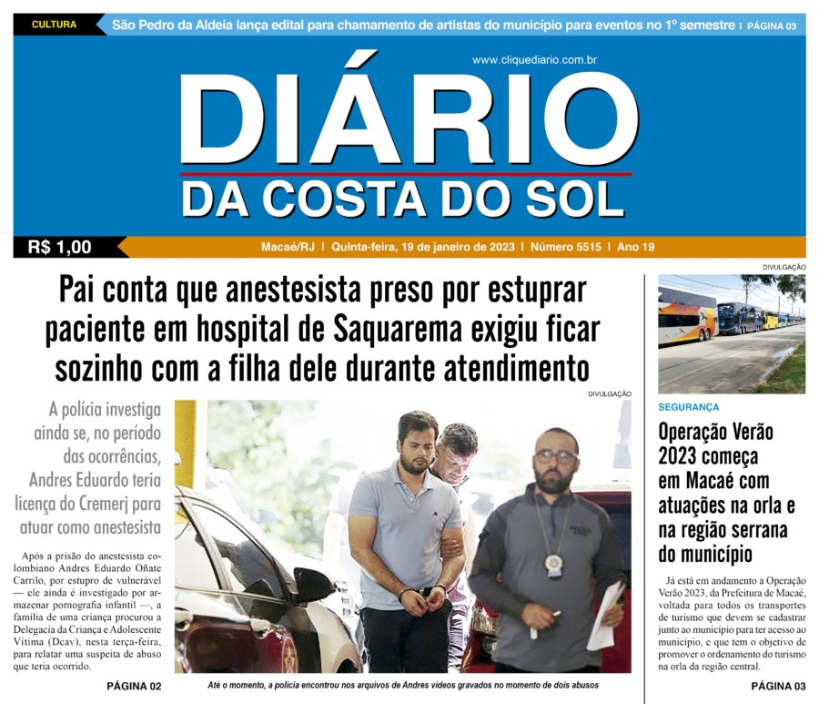 Edições Impressas Edição de quinta-feira 19/01/2023 nº 5515 Publicado em 19/01/2023 - 00:00 Escrito por Redação Notícias relacionadas: Seguinte Edição de sexta-feira 20/01/2023 nº 5516 Anterior Edição de quarta-feira 18/01/2023 nº 5514 Redação Notícias Recentes Cabo Frio15 horas atrás Arte e solidariedade marcam a 1ª Mostra de Dança Regional de Tamoios Cidades20 horas atrás Região serrana de Macaé recebe 1º X-Force Passeio de Quadriciclo e Aranha neste domingo (26) Polícia20 horas atrás Polícia apreende mais de meio quilo de drogas no Loteamento São João, em Rio das Ostras Saúde2 dias atrás Eventos esportivo e cultural reforça campanha do Outubro Rosa em Rio das Ostras nesse domingo, 26 Edições Impressas2 dias atrás Sábado a segunda-feira 25 a 27/10/2025 nº 6197 Cidades2 dias atrás Shopping Plaza Macaé oferece programação gratuita com feira de adoção e show de pagode neste fim de semana Cidades3 dias atrás 32º BPM completa 23 anos com solenidade de celebração e reconhecimento aos policiais Armação dos Búzios3 dias atrás Búzios celebra esporte e superação com XC RUN 2025 Araruama3 dias atrás Araruama promove saúde, lazer e cidadania em evento comunitário Arraial do cabo3 dias atrás Educação e sustentabilidade se encontram para jovens de Arraial do Cabo Clique Diário E. L. Mídia Editora Ltda CNPJ: 09.298.880/0001-07 Redação: Rua Tupinambás 122 Gloria – Macaé/RJ comercial@diariocs.com (22) 2765-7353 (22) 999253130 Mais lidas da semana Cultura7 dias atrás Silva Jardim anuncia shows gratuitos de samba e pagode para o fim de semana Cultura6 dias atrás Música, emoção e cores: Rodrigo Pontes apresenta show especial em Rio das Ostras Cabo Frio6 dias atrás Atletas de várias cidades se enfrentam em competição de Muay Thai em Cabo Frio Cabo Frio6 dias atrás Serviços essenciais permanecem ativos durante ponto facultativo em Cabo Frio