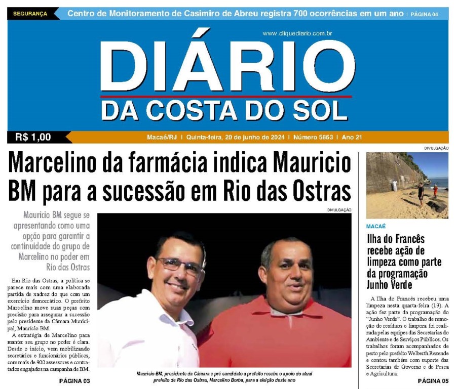 Edições Impressas Edição de quinta-feira 20/06/2024 nº 5863 Publicado em 20/06/2024 - 00:00 Escrito por Redação Notícias relacionadas: Seguinte Edição de sexta-feira 21/06/2024 nº 5864 Anterior Edição de quarta-feira 19/06/2024 nº 5862 Redação Notícias Recentes Polícia14 minutos atrás Polícia realiza operação de combate ao tráfico no Âncora, em Rio das Ostras Polícia1 hora atrás Polícia prende mais 4 por tráfico de drogas na Santa Catarina, em Rio das Ostras Polícia1 hora atrás Polícia Civil prende dupla com carro roubado no bairro Lagomar, em Macaé Cidades1 hora atrás Praia dos Cavaleiros recebe Circuito BB Lagos de Bodyboarding neste fim de semana Polícia1 hora atrás Dois homens são detidos com drogas e moto clonada durante patrulhamento no Lagomar Edições Impressas2 horas atrás Edição de terça-feira 11/11/2025 nº 6209 Cabo Frio18 horas atrás Polícia investiga ataque armado ocorrido em via rural de Cabo Frio Arraial do cabo18 horas atrás Gastronomia, música e chopp artesanal agitam a Praia Grande em Arraial do Cabo Cabo Frio19 horas atrás Convento Nossa Senhora dos Anjos em Cabo Frio recebe última edição do ‘Nosso Samba’ em 2025 Cabo Frio19 horas atrás Maracatu do Tambor de Cumba movimenta Cabo Frio no Novembro Negro em Museu Charitas Clique Diário E. L. Mídia Editora Ltda CNPJ: 09.298.880/0001-07 Redação: Rua Tupinambás 122 Gloria – Macaé/RJ comercial@diariocs.com (22) 2765-7353 (22) 999253130 Mais lidas da semana Arraial do cabo5 dias atrás Arraial do Cabo celebra 3ª edição do Festival de Frutos do Mar com entrada livre; Carol Biazin, Ramona Rox, Liah Soares e mais Cidades7 dias atrás HFM ganha novo Pronto-Socorro moderno e ampliado em Campos Meio Ambiente6 dias atrás Programa do governo estadual promove limpeza de rio no Âncora, em Rio das Ostras Meio Ambiente5 dias atrás Ações do Programa Limpa Rio seguem em vários pontos de Rio das Ostras