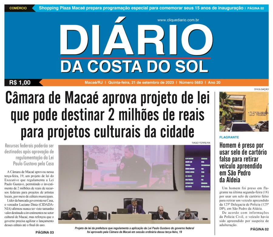 Edições Impressas Edição de quinta-feira 21/09/2023 nº 5683 Publicado em 20/09/2023 - 23:55 Escrito por Redação Notícias relacionadas: Seguinte Edição de sexta-feira 22/09/2023 nº 5684 Anterior Edição de quarta-feira 20/09/2023 nº 5682 Redação Notícias Recentes Cabo Frio1 dia atrás Estudantes de Cabo Frio brilham em premiação do projeto CaptaAção Meio Ambiente2 dias atrás Cepro promove encontro para discutir avanços e desafios da justiça climática em Rio das Ostras Armação dos Búzios2 dias atrás Búzios Swim celebra esporte, natureza e turismo na Região dos Lagos Cabo Frio2 dias atrás Educação pública de Cabo Frio colhe frutos com conquistas em competições científicas Edições Impressas2 dias atrás Edição de sábado a segunda-feira 08 a 10/11/2025 nº 6208 Polícia2 dias atrás Moto sem placa é abandonada após fuga de suspeito em Macaé Polícia2 dias atrás Polícia Civil prende homem em flagrante por tráfico de drogas no Parque Aeroporto, em Macaé Iguaba2 dias atrás Menina de Iguaba Grande realiza sonho e conhece o príncipe William no Rio de Janeiro Arraial do cabo2 dias atrás Arraial do Cabo é exemplo de tranquilidade na Região dos Lagos, segundo dados do ISP Arraial do cabo2 dias atrás Festival em Arraial do Cabo promete recorde de público com mais de 15 mil pratos e 10 mil litros de chope Clique Diário E. L. Mídia Editora Ltda CNPJ: 09.298.880/0001-07 Redação: Rua Tupinambás 122 Gloria – Macaé/RJ comercial@diariocs.com (22) 2765-7353 (22) 999253130 Mais lidas da semana Arraial do cabo4 dias atrás Arraial do Cabo celebra 3ª edição do Festival de Frutos do Mar com entrada livre; Carol Biazin, Ramona Rox, Liah Soares e mais Meio Ambiente4 dias atrás Programa do governo estadual promove limpeza de rio no Âncora, em Rio das Ostras Meio Ambiente3 dias atrás Ações do Programa Limpa Rio seguem em vários pontos de Rio das Ostras Cidades5 dias atrás HFM ganha novo Pronto-Socorro moderno e ampliado em Campos