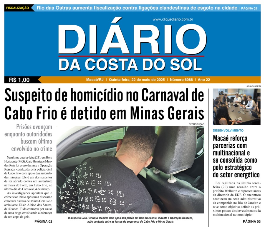 Edições Impressas Edição de quinta-feira, 22/05/2025 nº 6088 Publicado em 22/05/2025 - 09:20 Escrito por Redação Notícias relacionadas: Seguinte Edição de sexta-feira 23/05/2025 nº 6089 Anterior Edição de quarta-feira 21/05/2025 nº 6087 Redação Notícias Recentes Cidades13 horas atrás Macaé discute armamento da Guarda Municipal como parte de ações para fortalecer a segurança pública Araruama13 horas atrás Presos em Araruama tinham mandados por roubo e associação criminosa Educação13 horas atrás Inscrição para vagas nas creches de Rio das Ostras em 2026 termina nessa sexta, 14 Cabo Frio13 horas atrás Cabo Frio executa nova etapa de sinalização horizontal na cidade Cidades13 horas atrás Agricultores e pecuaristas de Quissamã participam de encontro de capacitação e orientação técnica Arraial do cabo13 horas atrás Nova licença digital promete mais agilidade e transparência em Arraial do Cabo Polícia13 horas atrás Idoso é assassinado a tiros às margens da BR-101, em Campos Esporte13 horas atrás Atletas de Rio das Ostras e Saquarema conquistam título de brasileiro de bodyboarding Arraial do cabo13 horas atrás Sucesso de vendas faz pratos especiais continuarem até o fim de novembro em Arraial no Festival de Frutos do Mar Cabo Frio14 horas atrás Iniciativa reforça compromisso com a identidade cultural cabo-friense Clique Diário E. L. Mídia Editora Ltda CNPJ: 09.298.880/0001-07 Redação: Rua Tupinambás 122 Gloria – Macaé/RJ comercial@diariocs.com (22) 2765-7353 (22) 999253130 Mais lidas da semana Cidades3 dias atrás Servidores de Rio das Ostras participam de treinamento do Estado em Búzios Polícia2 dias atrás Farmácia é interditada e uma pessoa é presa em Rio das Ostras em operação da Polícia Federal Polícia7 dias atrás Polícia prende 3 homens envolvidos com o tráfico em Rio das Ostras Cidades2 dias atrás Vereadores de Macaé vão embarcar nesta quinta para participar da COP 30 em Belém