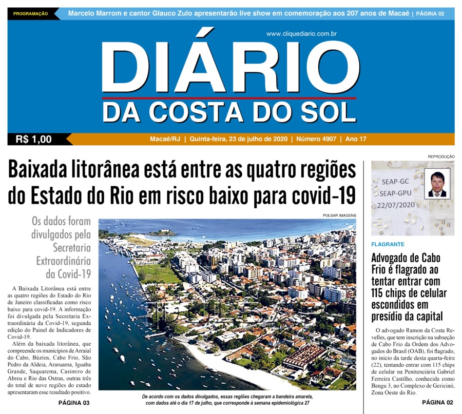 Edições Impressas Edição de quinta-feira 23/07/2020 nº 4907 Publicado em 23/07/2020 - 05:00 Escrito por Fernando Vitor Notícias relacionadas:destaque Seguinte Edição de Sexta-feira 24/07/2020 nº 4908 Anterior Edição de quarta-feira 22/07/2020 nº 4906 Fernando Vitor Notícias Recentes Cabo Frio15 horas atrás Arte e solidariedade marcam a 1ª Mostra de Dança Regional de Tamoios Cidades20 horas atrás Região serrana de Macaé recebe 1º X-Force Passeio de Quadriciclo e Aranha neste domingo (26) Polícia21 horas atrás Polícia apreende mais de meio quilo de drogas no Loteamento São João, em Rio das Ostras Saúde2 dias atrás Eventos esportivo e cultural reforça campanha do Outubro Rosa em Rio das Ostras nesse domingo, 26 Edições Impressas2 dias atrás Sábado a segunda-feira 25 a 27/10/2025 nº 6197 Cidades2 dias atrás Shopping Plaza Macaé oferece programação gratuita com feira de adoção e show de pagode neste fim de semana Cidades3 dias atrás 32º BPM completa 23 anos com solenidade de celebração e reconhecimento aos policiais Armação dos Búzios3 dias atrás Búzios celebra esporte e superação com XC RUN 2025 Araruama3 dias atrás Araruama promove saúde, lazer e cidadania em evento comunitário Arraial do cabo3 dias atrás Educação e sustentabilidade se encontram para jovens de Arraial do Cabo Clique Diário E. L. Mídia Editora Ltda CNPJ: 09.298.880/0001-07 Redação: Rua Tupinambás 122 Gloria – Macaé/RJ comercial@diariocs.com (22) 2765-7353 (22) 999253130 Mais lidas da semana Cultura7 dias atrás Silva Jardim anuncia shows gratuitos de samba e pagode para o fim de semana Cultura6 dias atrás Música, emoção e cores: Rodrigo Pontes apresenta show especial em Rio das Ostras Cabo Frio6 dias atrás Atletas de várias cidades se enfrentam em competição de Muay Thai em Cabo Frio Cabo Frio6 dias atrás Serviços essenciais permanecem ativos durante ponto facultativo em Cabo Frio