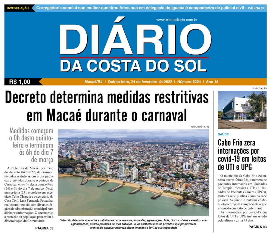 Edições Impressas Edição de quinta-feira 24/02/2022 nº 5294 Publicado em 23/02/2022 - 23:55 Escrito por Fernando Vitor Notícias relacionadas: Seguinte Edição de sexta-feira 25/02/2022 nº 5295 Anterior Edição de quarta-feira 23/02/2022 nº 5293 Fernando Vitor Notícias Recentes Arraial do cabo32 minutos atrás O poder da natureza e da memória em telas na mostra de Fransciscone Araújo em Arraial do Cabo Polícia2 horas atrás Acidente forte em Saquarema deixa duas pessoas feridas no fim de semana Cidades2 horas atrás Rio das Ostras estuda viabilização projetos sociais ligados à pesca artesanal Cidades2 horas atrás Prefeitura de Rio das Ostras reinaugura Sala INSS Digital no Centro de Cidadania Edições Impressas5 horas atrás Edição de terça-feira 18/11/2025 nº 6214 Cidades21 horas atrás Macaé registra avanço na coleta seletiva porta a porta e recolhe mais de 2 toneladas em 45 dias Meio Ambiente21 horas atrás Lagoa de Iriry, em Rio das Ostras, recebe nova sinalização focada em sustentabilidade Araruama21 horas atrás Araruama busca ampliar diálogo sobre saneamento antes de concluir revisão do PMSB Cabo Frio22 horas atrás Câmeras flagram colisão no restaurante Tia maluca seguida de fuga no Centro de Cabo Frio Cabo Frio22 horas atrás Cabo Frio reforça proteção ambiental após depredação na Trilha Translagunar Clique Diário E. L. Mídia Editora Ltda CNPJ: 09.298.880/0001-07 Redação: Rua Tupinambás 122 Gloria – Macaé/RJ comercial@diariocs.com (22) 2765-7353 (22) 999253130 Mais lidas da semana Cultura4 dias atrás Adilson Lopes apresenta exposição “Trajetória” em Casimiro de Abreu Polícia6 dias atrás Farmácia é interditada e uma pessoa é presa em Rio das Ostras em operação da Polícia Federal Cidades7 dias atrás Servidores de Rio das Ostras participam de treinamento do Estado em Búzios Cidades6 dias atrás Parceria com o Estado reforça prevenção de enchentes em Rio das Ostras há 39 dias do verão