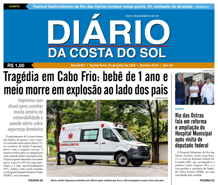 Edições Impressas Edição de quinta-feira 24/07/2025 nº 6131 Publicado em 24/07/2025 - 08:30 Escrito por Redação Notícias relacionadas: Seguinte Edição de sexta-feira 25/07/2025 nº 6132 Anterior Edição de quarta-feira 23/07/2025 nº 6130 Redação Notícias Recentes Polícia50 segundos atrás Rua do tráfico: PM prende 5º traficante na mesma rua em Rio das Ostras em menos de uma semana Polícia12 minutos atrás Denúncia anônima leva polícia a recuperar três carros roubados em Macaé Cidades18 horas atrás Prefeitura de Macaé divulga 14º edital de convocação do Concurso Público 01/2024 Cidades18 horas atrás Casa do Servidor de Macaé ultrapassa 3 mil atendimentos em menos de um ano Cidades18 horas atrás Defesa Civil de Rio das Ostras participa de oficina sobre riscos geológicos Polícia19 horas atrás Denúncia de violência contra idosos leva à prisão de homem procurado por homicídio em Campos Cabo Frio19 horas atrás Empreendedores da cultura participam de formação gratuita em Cabo Frio Cabo Frio19 horas atrás ESF de CaboFrio realiza encontro de conscientização e ações no Outubro Rosa Cidades20 horas atrás Prefeitura encontra vazamento de esgoto em rede coletora da Rio+, em Rio das Ostras Arraial do cabo20 horas atrás Estruturas irregulares são retiradas durante operação conjunta na Praia do Forno em Arraial do Cabo Clique Diário E. L. Mídia Editora Ltda CNPJ: 09.298.880/0001-07 Redação: Rua Tupinambás 122 Gloria – Macaé/RJ comercial@diariocs.com (22) 2765-7353 (22) 999253130 Mais lidas da semana Cultura4 dias atrás Silva Jardim anuncia shows gratuitos de samba e pagode para o fim de semana Polícia7 dias atrás Briga em Restaurante Popular termina com uma pessoa morta a facadas em Macaé Edições Impressas2 dias atrás Edição de quarta-feira 22/10/2025 nº 6195 Polícia4 dias atrás Policiais da PRF salvam bebê engasgado na BR-101, em Campos