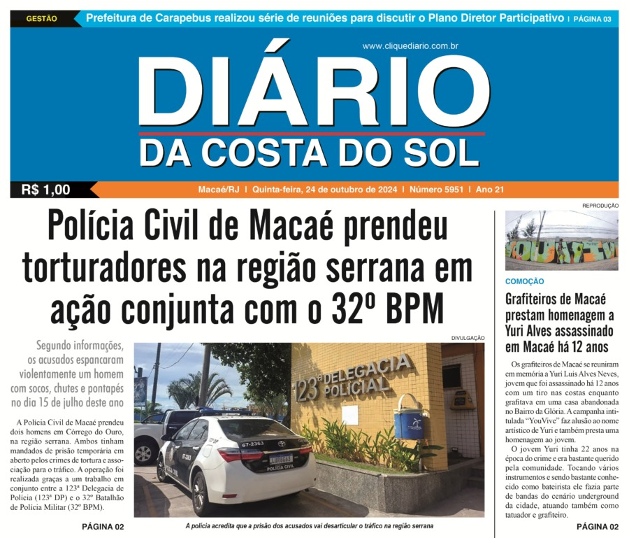 Edições Impressas Edição de quinta-feira 24/10/2024 nº 5951 Publicado em 24/10/2024 - 00:00 Escrito por Redação Notícias relacionadas: Seguinte Edição de sexta-feira 25/10/2024 nº 5952 Anterior Edição de quarta-feira 23/10/2024 nº 5950 Redação Notícias Recentes Cidades14 minutos atrás Macaé marca presença na OTC Brasil e reforça papel estratégico no setor de energia Saúde26 minutos atrás Unidade de Saúde do Adolescente de Rio das Ostras comemora 20 anos com várias atividades Cultura18 horas atrás Rio das Ostras tem 2 cineclubes selecionados para 2ª Mostra Mercosul Audiovisual Cidades18 horas atrás Câmara de Macaé debate aumento de acidentes e propõe Semana de Prevenção a Acidentes com Motociclistas Arraial do cabo18 horas atrás Instituto de Previdência de Arraial do Cabo aplica provas objetivas neste domingo (2) Cidades18 horas atrás Quissamã é destaque nacional ao integrar rede de inovação em Atenção Primária à Saúde da Fiocruz Cabo Frio18 horas atrás Cabo Frio inicia obra de reestruturação na Praça São Benedito para melhorar mobilidade e segurança Cabo Frio19 horas atrás Obra na Rua dos Biquínis marca nova fase de valorização dos espaços públicos em Cabo Frio Polícia19 horas atrás Mulher é morta a tiros enquanto carregava bebê no colo em Campos Armação dos Búzios19 horas atrás Búzios sedia Encontro Fluminense FBHA com foco no fortalecimento do turismo regional Clique Diário E. L. Mídia Editora Ltda CNPJ: 09.298.880/0001-07 Redação: Rua Tupinambás 122 Gloria – Macaé/RJ comercial@diariocs.com (22) 2765-7353 (22) 999253130 Mais lidas da semana Edições Impressas4 dias atrás Edição de sábado a segunda-feira 25 a 27/10/2025 nº 6198 Cidades5 dias atrás Macaé Cup vai agitar a serra com o maior torneio de futebol infantil da região Cidadania5 dias atrás Plano Diretor de Rio das Ostras é tema de fórum da sociedade civil nesse sábado, 25 Edições Impressas5 dias atrás Edição de sexta-feira 24/10/2025 nº 6197