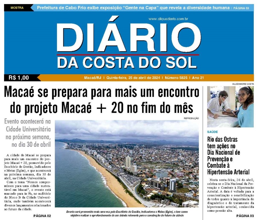 Edições Impressas Edição de quinta-feira 25/04/2024 nº 5825 Publicado em 25/04/2024 - 00:00 Escrito por Redação Notícias relacionadas: Seguinte Edição de sexta-feira 26/04/2024 nº 5826 Anterior Edição de Terça e quarta-feira 23 e 24/04/2024 nº 5824 Redação Notícias Recentes Cabo Frio16 horas atrás Arte e solidariedade marcam a 1ª Mostra de Dança Regional de Tamoios Cidades22 horas atrás Região serrana de Macaé recebe 1º X-Force Passeio de Quadriciclo e Aranha neste domingo (26) Polícia22 horas atrás Polícia apreende mais de meio quilo de drogas no Loteamento São João, em Rio das Ostras Saúde2 dias atrás Eventos esportivo e cultural reforça campanha do Outubro Rosa em Rio das Ostras nesse domingo, 26 Edições Impressas2 dias atrás Sábado a segunda-feira 25 a 27/10/2025 nº 6197 Cidades2 dias atrás Shopping Plaza Macaé oferece programação gratuita com feira de adoção e show de pagode neste fim de semana Cidades3 dias atrás 32º BPM completa 23 anos com solenidade de celebração e reconhecimento aos policiais Armação dos Búzios3 dias atrás Búzios celebra esporte e superação com XC RUN 2025 Araruama3 dias atrás Araruama promove saúde, lazer e cidadania em evento comunitário Arraial do cabo3 dias atrás Educação e sustentabilidade se encontram para jovens de Arraial do Cabo Clique Diário E. L. Mídia Editora Ltda CNPJ: 09.298.880/0001-07 Redação: Rua Tupinambás 122 Gloria – Macaé/RJ comercial@diariocs.com (22) 2765-7353 (22) 999253130 Mais lidas da semana Cultura7 dias atrás Silva Jardim anuncia shows gratuitos de samba e pagode para o fim de semana Cultura6 dias atrás Música, emoção e cores: Rodrigo Pontes apresenta show especial em Rio das Ostras Polícia7 dias atrás Policiais da PRF salvam bebê engasgado na BR-101, em Campos Cabo Frio7 dias atrás Atletas de várias cidades se enfrentam em competição de Muay Thai em Cabo Frio