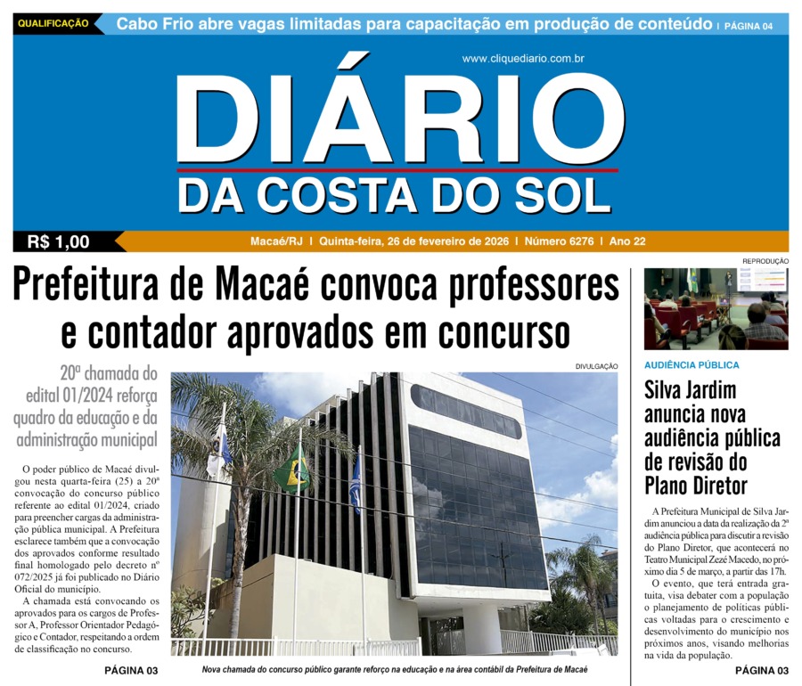 Edições Impressas Edição de quinta-feira 26/02/2026 nº 6276 Publicado em 26/02/2026 - 09:25 Escrito por Redação Notícias relacionadas: Anterior Edição de quarta-feira 25/02/2026 nº 6275 Redação Notícias Recentes Cidades3 minutos atrás Silva Jardim está perto de ganhar nova base do Corpo de Bombeiros Saúde52 minutos atrás Rio das Ostras abre processo seletivo para contratação temporária na Saúde Polícia1 hora atrás Polícia realiza grande apreensão de drogas após denúncia em Rio das Ostras Cidades1 hora atrás Temporal provoca queda de pontes e interdições entre Glicério, Frade e Sana Polícia2 horas atrás Mulher é presa por tentativa de homicídio contra companheiro em Macaé Edições Impressas2 horas atrás Edição de quinta-feira 26/02/2026 nº 6276 Política18 horas atrás Rio das Ostras cria grupo de trabalho para atender demandas do TCE-RJ Cidades18 horas atrás Macaé divulga 20ª convocação do concurso público 01/2024 Araruama19 horas atrás Araruama reúne 240 animais em exposição no Parque Agropecuário Cabo Frio19 horas atrás Cabo Frio recebe apoio de Magé para cumprimento de mandado judicial Clique Diário E. L. Mídia Editora Ltda CNPJ: 09.298.880/0001-07 Redação: Rua Tupinambás 122 Gloria – Macaé/RJ comercial@diariocs.com (22) 2765-7353 (22) 999253130 Mais lidas da semana Saúde3 dias atrás Caminhada marca Dia Nacional de Combate às Drogas e ao Alcoolismo em Silva Jardim Cidades6 dias atrás Rio das Ostras flagra mais 5 ligações clandestinas de esgoto em ação pós-Carnaval São Pedro da Aldeia6 dias atrás Escola de Artes de São Pedro da Aldeia divulga calendário presencial de inscrições Cidades5 dias atrás Projeto Verão para Todos promove inclusão com banho de mar assistido na Praia da Imbetiba