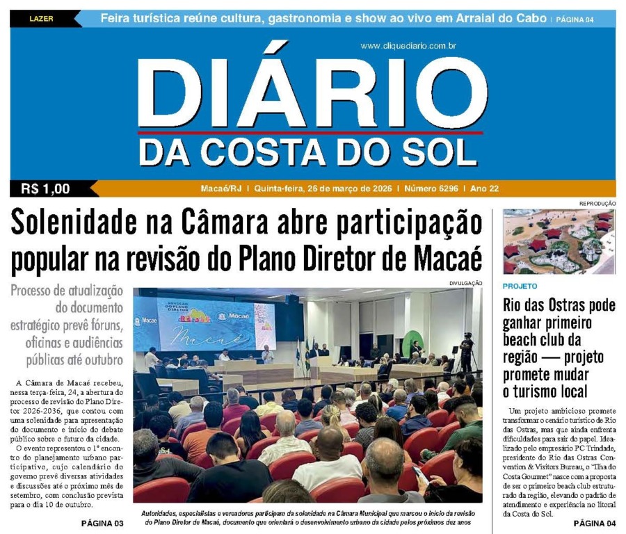 Edições Impressas Edição de quinta-feira 26/03/2026 nº 6296 Publicado em 26/03/2026 - 09:45 Escrito por Redação Notícias relacionadas: Anterior Edição de quarta-feira 25/03/2026 nº 6295 Redação Notícias Recentes Polícia16 minutos atrás Polícia prende homem em Macaé por importunação sexual e atos obscenos Edições Impressas43 minutos atrás Edição de quinta-feira 26/03/2026 nº 6296 Polícia18 horas atrás Ação da Polícia Civil com a Rio+ identifica furto de água no centro de Rio das Ostras Cabo Frio18 horas atrás Operação noturna intensifica controle de trânsito no Jardim Esperança em Cabo Frio Cabo Frio18 horas atrás Pitbull que atacava pets é capturado e caso acende alerta sobre responsabilidade em Cabo Frio Cabo Frio18 horas atrás Audiência pública em Cabo Frio trata de limites e direitos no uso de estruturas de praia Arraial do cabo18 horas atrás Feira turística reúne cultura, gastronomia e show ao vivo em Arraial do Cabo Arraial do cabo18 horas atrás Arraial do Cabo integra painel sobre desenvolvimento turístico e inovação no RJ Turismo18 horas atrás Fórum de Turismo ganha força com palestras de Marco Navega e Wania Monnerat Mobilidade18 horas atrás Trecho da RJ-106 entre Niterói e Macaé começa a receber 133 novos radares Clique Diário E. L. Mídia Editora Ltda CNPJ: 09.298.880/0001-07 Redação: Rua Tupinambás 122 Gloria – Macaé/RJ comercial@diariocs.com (22) 2765-7353 (22) 999253130 Mais lidas da semana Cidades19 horas atrás Câmara de Macaé sofre apagão durante debate com representantes da Enel Polícia6 dias atrás Mais um adolescente é detido em Rio das Ostras por envolvimento com o tráfico Edições Impressas6 dias atrás Edição de sexta-feira 20/03/2026 nº 6292 Desenvolvimento2 dias atrás Macaé recebe prêmio do Sebrae por serviços prestados aos empreendedores