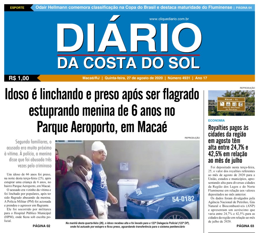 Edições Impressas Edição de quinta-feira 27/08/2020 nº 4931 Publicado em 27/08/2020 - 05:00 Escrito por Fernando Vitor Notícias relacionadas: Seguinte Edição de sexta-feira 28/08/2020 nº 4932 Anterior Edição de quarta-feira 26/08/2020 nº 4930 Fernando Vitor Notícias Recentes Cabo Frio12 horas atrás Arte e solidariedade marcam a 1ª Mostra de Dança Regional de Tamoios Cidades18 horas atrás Região serrana de Macaé recebe 1º X-Force Passeio de Quadriciclo e Aranha neste domingo (26) Polícia18 horas atrás Polícia apreende mais de meio quilo de drogas no Loteamento São João, em Rio das Ostras Saúde2 dias atrás Eventos esportivo e cultural reforça campanha do Outubro Rosa em Rio das Ostras nesse domingo, 26 Edições Impressas2 dias atrás Sábado a segunda-feira 25 a 27/10/2025 nº 6197 Cidades2 dias atrás Shopping Plaza Macaé oferece programação gratuita com feira de adoção e show de pagode neste fim de semana Cidades2 dias atrás 32º BPM completa 23 anos com solenidade de celebração e reconhecimento aos policiais Armação dos Búzios2 dias atrás Búzios celebra esporte e superação com XC RUN 2025 Araruama2 dias atrás Araruama promove saúde, lazer e cidadania em evento comunitário Arraial do cabo2 dias atrás Educação e sustentabilidade se encontram para jovens de Arraial do Cabo Clique Diário E. L. Mídia Editora Ltda CNPJ: 09.298.880/0001-07 Redação: Rua Tupinambás 122 Gloria – Macaé/RJ comercial@diariocs.com (22) 2765-7353 (22) 999253130 Mais lidas da semana Cultura6 dias atrás Silva Jardim anuncia shows gratuitos de samba e pagode para o fim de semana Cultura6 dias atrás Música, emoção e cores: Rodrigo Pontes apresenta show especial em Rio das Ostras Cabo Frio6 dias atrás Atletas de várias cidades se enfrentam em competição de Muay Thai em Cabo Frio Cabo Frio6 dias atrás Serviços essenciais permanecem ativos durante ponto facultativo em Cabo Frio