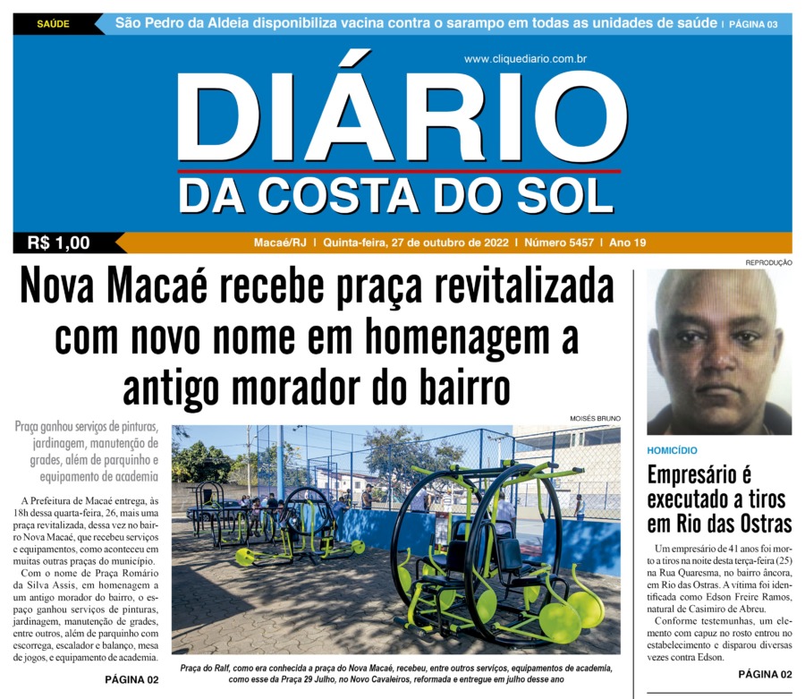Edições Impressas Edição de quinta-feira 27/10/2022 nº 5457 Publicado em 27/10/2022 - 06:41 Escrito por Fernando Vitor Notícias relacionadas: Seguinte Edição de sexta-feira 28/10/2022 nº 5458 Anterior Edição de quarta-feira 26/10/2022 nº 5456 Fernando Vitor Notícias Recentes Cabo Frio10 horas atrás Cabo Frio antecipa a Black Friday com grandes marcas e atrações musicais Cidades14 horas atrás Procon de Rio das Ostras investiga denúncias de cobrança dupla na Enel Cidades16 horas atrás Macaé sediará o 8º Encontro Fluminense de Arborização Urbana em dezembro Cultura2 dias atrás Teatro de Rio das Ostras recebe 2 espetáculos de dança nesse fim de semana Arraial do cabo2 dias atrás FIPAC oferece serviços de saúde e prevenção ao câncer de próstata em Arraial do Cabo Arraial do cabo2 dias atrás Resultado preliminar do concurso de Arraial já está no ar pelo IBAM Edições Impressas2 dias atrás Edição de sábado a segunda-feira 15 a 17/11/2025 nº 6213 Cidades2 dias atrás Shopping Plaza Macaé inicia programação de Natal neste fim de semana Cabo Frio2 dias atrás Disputa em dobro marca encerramento em Cabo Frio do circuito de surf Cabo Frio2 dias atrás Agentes de Cabo Frio recebem novo treinamento técnico para atuar em casos de poluição sonora Clique Diário E. L. Mídia Editora Ltda CNPJ: 09.298.880/0001-07 Redação: Rua Tupinambás 122 Gloria – Macaé/RJ comercial@diariocs.com (22) 2765-7353 (22) 999253130 Mais lidas da semana Cultura3 dias atrás Adilson Lopes apresenta exposição “Trajetória” em Casimiro de Abreu Cidades5 dias atrás Servidores de Rio das Ostras participam de treinamento do Estado em Búzios Polícia5 dias atrás Farmácia é interditada e uma pessoa é presa em Rio das Ostras em operação da Polícia Federal Esporte2 dias atrás De Saquarema para o Brasileirão: Vasco troca gramado de São Januário