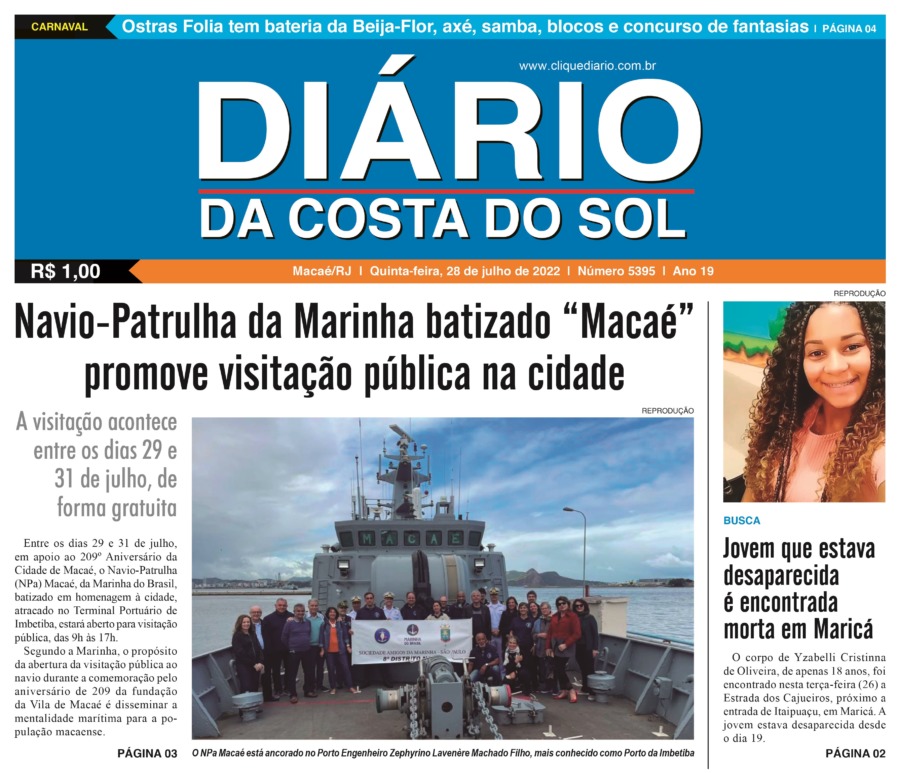 Edições Impressas Edição de quinta-feira 28/07/2022 nº 5395 Publicado em 27/07/2022 - 23:55 Escrito por Fernando Vitor Notícias relacionadas: Seguinte Edição de sexta a segunda-feira 29_07 a 01_08_2022 nº 5396 Anterior Edição de quarta-feira 27/07/2022 nº 5394 Fernando Vitor Notícias Recentes Cabo Frio12 horas atrás Cabo Frio antecipa a Black Friday com grandes marcas e atrações musicais Cidades16 horas atrás Procon de Rio das Ostras investiga denúncias de cobrança dupla na Enel Cidades18 horas atrás Macaé sediará o 8º Encontro Fluminense de Arborização Urbana em dezembro Cultura2 dias atrás Teatro de Rio das Ostras recebe 2 espetáculos de dança nesse fim de semana Arraial do cabo2 dias atrás FIPAC oferece serviços de saúde e prevenção ao câncer de próstata em Arraial do Cabo Arraial do cabo2 dias atrás Resultado preliminar do concurso de Arraial já está no ar pelo IBAM Edições Impressas2 dias atrás Edição de sábado a segunda-feira 15 a 17/11/2025 nº 6213 Cidades2 dias atrás Shopping Plaza Macaé inicia programação de Natal neste fim de semana Cabo Frio2 dias atrás Disputa em dobro marca encerramento em Cabo Frio do circuito de surf Cabo Frio2 dias atrás Agentes de Cabo Frio recebem novo treinamento técnico para atuar em casos de poluição sonora Clique Diário E. L. Mídia Editora Ltda CNPJ: 09.298.880/0001-07 Redação: Rua Tupinambás 122 Gloria – Macaé/RJ comercial@diariocs.com (22) 2765-7353 (22) 999253130 Mais lidas da semana Cultura3 dias atrás Adilson Lopes apresenta exposição “Trajetória” em Casimiro de Abreu Cidades5 dias atrás Servidores de Rio das Ostras participam de treinamento do Estado em Búzios Polícia5 dias atrás Farmácia é interditada e uma pessoa é presa em Rio das Ostras em operação da Polícia Federal Esporte2 dias atrás De Saquarema para o Brasileirão: Vasco troca gramado de São Januário