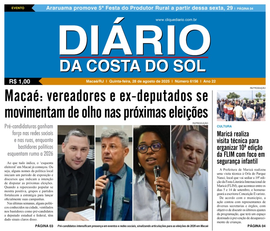 Edições Impressas Edição de quinta-feira 28/08/2025 nº 6156 Publicado em 28/08/2025 - 09:28 Escrito por Redação Notícias relacionadas: Seguinte Edição de sexta-feira 29/08/2025 nº 6157 Anterior Edição de quarta-feira 27/08/2025 nº 6155 Redação Notícias Recentes Cabo Frio1 dia atrás Estudantes de Cabo Frio brilham em premiação do projeto CaptaAção Armação dos Búzios1 dia atrás Búzios Swim celebra esporte, natureza e turismo na Região dos Lagos Cabo Frio1 dia atrás Educação pública de Cabo Frio colhe frutos com conquistas em competições científicas Edições Impressas1 dia atrás Edição de sábado a segunda-feira 08 a 10/11/2025 nº 6208 Polícia1 dia atrás Moto sem placa é abandonada após fuga de suspeito em Macaé Polícia1 dia atrás Polícia Civil prende homem em flagrante por tráfico de drogas no Parque Aeroporto, em Macaé Iguaba2 dias atrás Menina de Iguaba Grande realiza sonho e conhece o príncipe William no Rio de Janeiro Arraial do cabo2 dias atrás Arraial do Cabo é exemplo de tranquilidade na Região dos Lagos, segundo dados do ISP Arraial do cabo2 dias atrás Festival em Arraial do Cabo promete recorde de público com mais de 15 mil pratos e 10 mil litros de chope Arraial do cabo2 dias atrás Oficina une saúde, cidadania e acolhimento em Arraial do Cabo Clique Diário E. L. Mídia Editora Ltda CNPJ: 09.298.880/0001-07 Redação: Rua Tupinambás 122 Gloria – Macaé/RJ comercial@diariocs.com (22) 2765-7353 (22) 999253130 Mais lidas da semana Arraial do cabo3 dias atrás Arraial do Cabo celebra 3ª edição do Festival de Frutos do Mar com entrada livre; Carol Biazin, Ramona Rox, Liah Soares e mais Meio Ambiente4 dias atrás Programa do governo estadual promove limpeza de rio no Âncora, em Rio das Ostras Meio Ambiente3 dias atrás Ações do Programa Limpa Rio seguem em vários pontos de Rio das Ostras Cidades5 dias atrás HFM ganha novo Pronto-Socorro moderno e ampliado em Campos