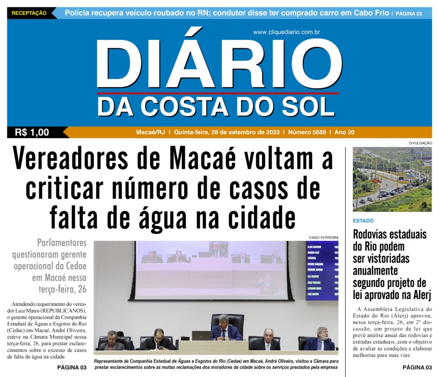 Edições Impressas Edição de quinta-feira 28/09/2023 nº 5688 Publicado em 27/09/2023 - 23:54 Escrito por Redação Notícias relacionadas: Seguinte Edição de sexta-feira 29/09/2023 nº 5689 Anterior Edição de quarta-feira 27/09/2023 nº 5687 Redação Notícias Recentes Cabo Frio1 dia atrás Estudantes de Cabo Frio brilham em premiação do projeto CaptaAção Armação dos Búzios1 dia atrás Búzios Swim celebra esporte, natureza e turismo na Região dos Lagos Cabo Frio1 dia atrás Educação pública de Cabo Frio colhe frutos com conquistas em competições científicas Edições Impressas1 dia atrás Edição de sábado a segunda-feira 08 a 10/11/2025 nº 6208 Polícia1 dia atrás Moto sem placa é abandonada após fuga de suspeito em Macaé Polícia1 dia atrás Polícia Civil prende homem em flagrante por tráfico de drogas no Parque Aeroporto, em Macaé Iguaba2 dias atrás Menina de Iguaba Grande realiza sonho e conhece o príncipe William no Rio de Janeiro Arraial do cabo2 dias atrás Arraial do Cabo é exemplo de tranquilidade na Região dos Lagos, segundo dados do ISP Arraial do cabo2 dias atrás Festival em Arraial do Cabo promete recorde de público com mais de 15 mil pratos e 10 mil litros de chope Arraial do cabo2 dias atrás Oficina une saúde, cidadania e acolhimento em Arraial do Cabo Clique Diário E. L. Mídia Editora Ltda CNPJ: 09.298.880/0001-07 Redação: Rua Tupinambás 122 Gloria – Macaé/RJ comercial@diariocs.com (22) 2765-7353 (22) 999253130 Mais lidas da semana Arraial do cabo3 dias atrás Arraial do Cabo celebra 3ª edição do Festival de Frutos do Mar com entrada livre; Carol Biazin, Ramona Rox, Liah Soares e mais Meio Ambiente4 dias atrás Programa do governo estadual promove limpeza de rio no Âncora, em Rio das Ostras Meio Ambiente3 dias atrás Ações do Programa Limpa Rio seguem em vários pontos de Rio das Ostras Cidades5 dias atrás HFM ganha novo Pronto-Socorro moderno e ampliado em Campos