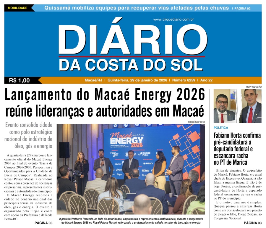 Edições Impressas Edição de quinta-feira 29/01/2026 nº 6259 Publicado em 29/01/2026 - 09:31 Escrito por Redação Notícias relacionadas: Anterior Edição de quarta-feira, 28/01/2026 nº 6258 Redação Notícias Recentes Edições Impressas14 minutos atrás Edição de quinta-feira 29/01/2026 nº 6259 Cabo Frio16 horas atrás Cabo Frio reúne artistas locais no evento o canto do forte Cabo Frio16 horas atrás Cabo Frio reforça respeito e inclusão da população trans em ação de saúde Cidades17 horas atrás Macaé Energy 2026 é lançado oficialmente durante evento sobre a Bacia de Campos Cidades17 horas atrás Rio das Ostras promove grande operação junto a pessoas em situação em situação de rua Polícia17 horas atrás Câmeras de monitoramento de Macaé ajudam a prender homem procurado pela Justiça Cabo Frio18 horas atrás Corpo de homem de 81 anos é localizado após mais de 24 horas de buscas em Cabo Frio Cidades18 horas atrás Sesc Verão segue agitando Macaé com show de Geraldo Azevedo neste sábado Arraial do cabo18 horas atrás Férias escolares ganham desafio online para estudantes de Arraial do Cabo Cabo Frio18 horas atrás Cabo Frio estabelece novos meios de contato com o canil municipal Clique Diário E. L. Mídia Editora Ltda CNPJ: 09.298.880/0001-07 Redação: Rua Tupinambás 122 Gloria – Macaé/RJ comercial@diariocs.com (22) 2765-7353 (22) 999253130 Mais lidas da semana Segurança Pública7 dias atrás Prefeito de Rio das Ostras participa de importante lançamento do Estado Cidades7 dias atrás Macaé abre inscrições para escolinha de surf “Tirando Onda” Cabo Frio6 dias atrás Luto: Falecimento de Aline Azevedo primeira-dama comove Cabo Frio Turismo7 dias atrás Maricá assina acordo de R$ 1,5 bilhão durante feira de turismo na Espanha