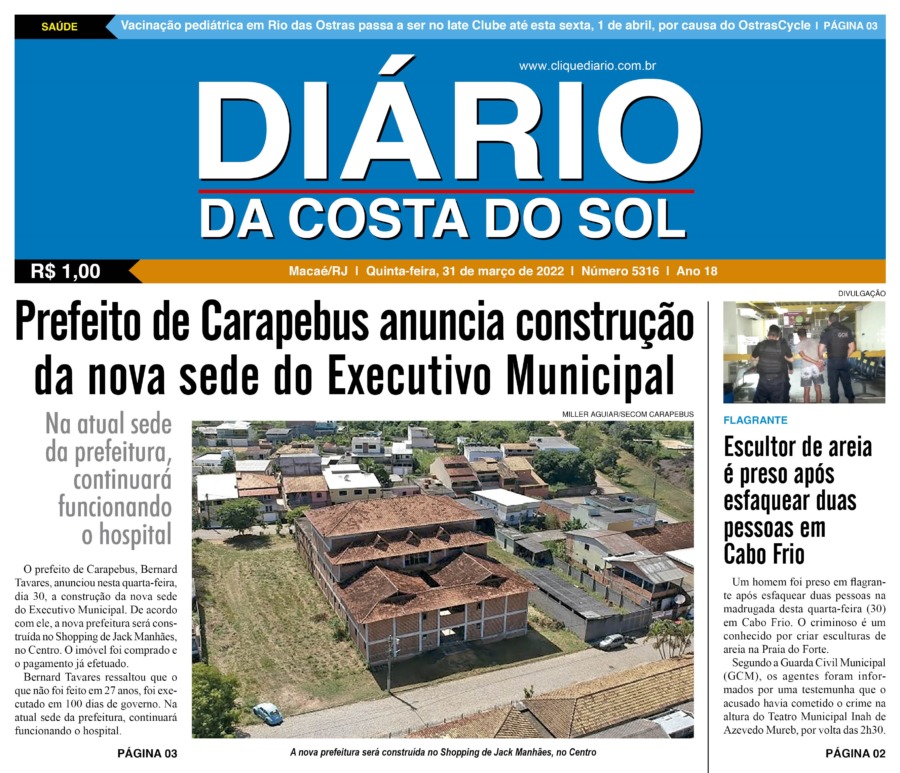 Edições Impressas Edição de quinta-feira 31/03/2022 nº 5316 Publicado em 30/03/2022 - 23:55 Escrito por Fernando Vitor Notícias relacionadas: Seguinte Edição de sexta-feira 01/04/2022 nº 5317 Anterior Edição de quarta-feira 30/03/2022 nº 5315 Fernando Vitor Notícias Recentes Cidadania12 minutos atrás Distrito de Casimiro de Abreu recebe Programa RJ para Todos, do governo estadual Cultura2 horas atrás Moda e Prosa Caipira tem sua 6ª edição nessa quinta, 20, em Saquarema Comércio4 horas atrás Rio das Ostras tem 19ª edição de sua tradicional feira outlet nesse feriado Cidades4 horas atrás Macaé recebe 20ª edição do Prefeitura Presente no dia 25 de novembro Polícia5 horas atrás Denúncia anônima leva à prisão de duas mulheres por tráfico em Macaé Cidades5 horas atrás Caravana de Natal Coca-Cola passa por Rio das Ostras e Casimiro de Abreu nessa quinta, 20 Edições Impressas6 horas atrás Edição de quarta-feira 19/11/2025 nº 6215 Arraial do cabo22 horas atrás Educação de Arraial do Cabo orienta responsáveis sobre rematrícula para o próximo ano Cabo Frio22 horas atrás Evento comercial mais aguardado de Cabo Frio atinge 100% de estandes vendidos Saúde23 horas atrás Rio das Ostras comemora melhorias no atendimento da saúde municipal Clique Diário E. L. Mídia Editora Ltda CNPJ: 09.298.880/0001-07 Redação: Rua Tupinambás 122 Gloria – Macaé/RJ comercial@diariocs.com (22) 2765-7353 (22) 999253130 Mais lidas da semana Cultura5 dias atrás Adilson Lopes apresenta exposição “Trajetória” em Casimiro de Abreu Cidades7 dias atrás Parceria com o Estado reforça prevenção de enchentes em Rio das Ostras há 39 dias do verão Meio Ambiente2 dias atrás Lagoa de Iriry, em Rio das Ostras, recebe nova sinalização focada em sustentabilidade Cidades2 dias atrás Macaé registra avanço na coleta seletiva porta a porta e recolhe mais de 2 toneladas em 45 dias