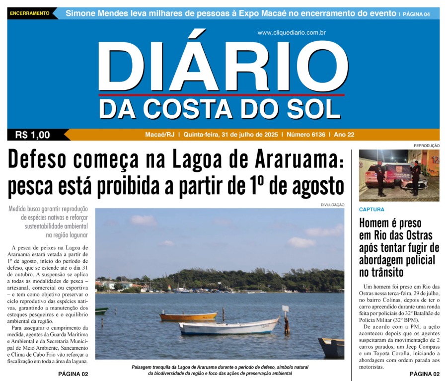 Edições Impressas Edição de quinta-feira 31/07/2025 nº 6136 Publicado em 31/07/2025 - 09:32 Escrito por Redação Notícias relacionadas: Seguinte Edição de sexta-feira 01/08/2025 nº 6137 Anterior Edição de quarta-feira 30/07/2025 nº 6135 Redação Notícias Recentes Saúde16 horas atrás Eventos esportivo e cultural reforça campanha do Outubro Rosa em Rio das Ostras nesse domingo, 26 Edições Impressas19 horas atrás Sábado a segunda-feira 25 a 27/10/2025 nº 6197 Cidades21 horas atrás Shopping Plaza Macaé oferece programação gratuita com feira de adoção e show de pagode neste fim de semana Cidades2 dias atrás 32º BPM completa 23 anos com solenidade de celebração e reconhecimento aos policiais Armação dos Búzios2 dias atrás Búzios celebra esporte e superação com XC RUN 2025 Araruama2 dias atrás Araruama promove saúde, lazer e cidadania em evento comunitário Arraial do cabo2 dias atrás Educação e sustentabilidade se encontram para jovens de Arraial do Cabo Cidades2 dias atrás Quissamã avança na reformulação do Currículo Municipal de Educação Arraial do cabo2 dias atrás PIPE estimula presença e desempenho de alunos da rede pública de Arraial em programa estudantil Cabo Frio2 dias atrás Prefeitura de Cabo Frio prepara espaço para visitação no Dia de Finados Clique Diário E. L. Mídia Editora Ltda CNPJ: 09.298.880/0001-07 Redação: Rua Tupinambás 122 Gloria – Macaé/RJ comercial@diariocs.com (22) 2765-7353 (22) 999253130 Mais lidas da semana Cultura6 dias atrás Silva Jardim anuncia shows gratuitos de samba e pagode para o fim de semana Cabo Frio5 dias atrás Serviços essenciais permanecem ativos durante ponto facultativo em Cabo Frio Polícia6 dias atrás Policiais da PRF salvam bebê engasgado na BR-101, em Campos Arraial do cabo5 dias atrás Prisão em flagrante marca operação da Patrulha Maria da Penha em Arraial do Cabo