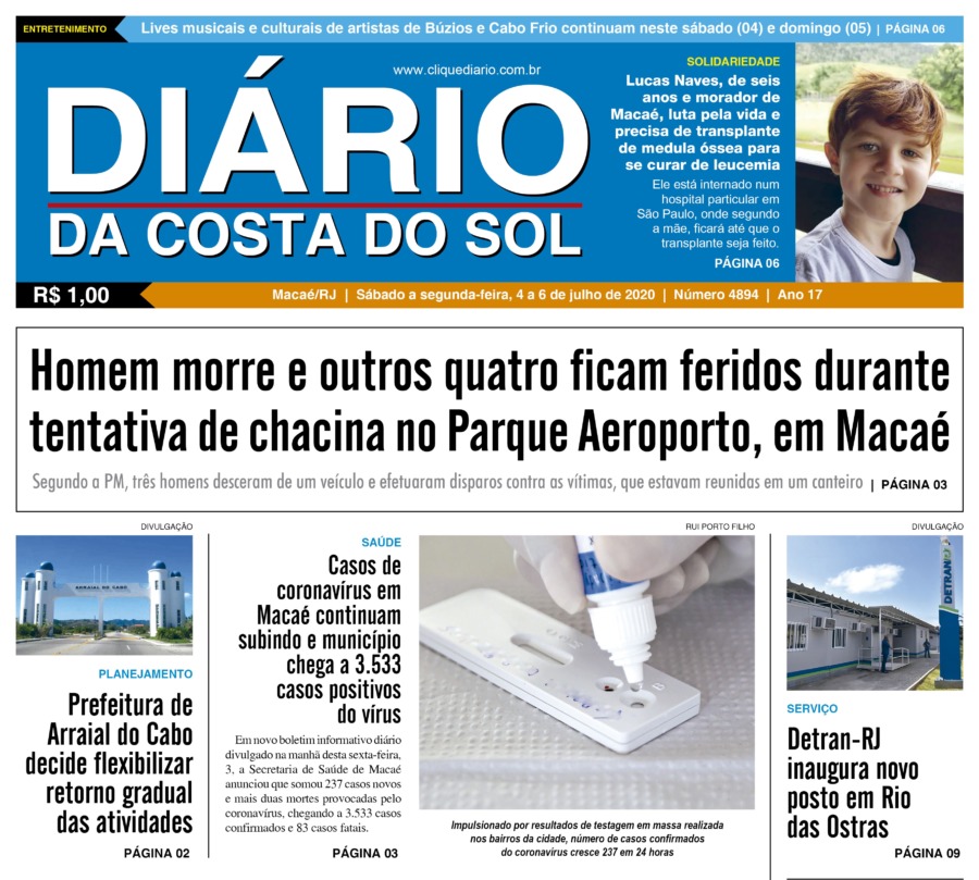 Edições Impressas Edição de Sáb a Seg 04 a 06/07/2020 nº 4894 Publicado em 04/07/2020 - 05:00 Escrito por Fernando Vitor Notícias relacionadas: Seguinte Edição de terça-feira 07/07/2020 nº 4895 Anterior Edição de sexta-feira 03/06/2020 nº 4893 Fernando Vitor Notícias Recentes Arraial do cabo26 minutos atrás ROMU intercepta motociclista que tentou fugir após empinar moto em Arraial do Cabo Polícia34 minutos atrás Polícia apreende mais de 10 mil reais em bebidas sem nota fiscal em Rio das Ostras Arraial do cabo50 minutos atrás Ação conjunta entre CPROEIS e PATAMO prende suspeito com drogas em Arraial do Cabo Sem categoria3 horas atrás Atleta do Cabo Frio + Esporte é destaque na Corrida do Guardião Cidades4 horas atrás Mulheres de Saquarema participam de atividade lúdica sobre autoconhecimento Diversão4 horas atrás Silva Jardim celebra o Mês das Crianças com mais uma atividade no Centro Polícia5 horas atrás Polícia descobre esconderijo do tráfico e apreende grande quantidade de drogas em Macaé Polícia5 horas atrás Homem é preso com 105 cápsulas de cocaína em localidade de Rio das Ostras Polícia5 horas atrás Criminoso foge após perseguição e drogas são apreendidas em Macaé Polícia5 horas atrás Traficante é preso em Macaé após perseguição policial no Parque Aeroporto Clique Diário E. L. Mídia Editora Ltda CNPJ: 09.298.880/0001-07 Redação: Rua Tupinambás 122 Gloria – Macaé/RJ comercial@diariocs.com (22) 2765-7353 (22) 999253130 Mais lidas da semana Cultura6 dias atrás Música, emoção e cores: Rodrigo Pontes apresenta show especial em Rio das Ostras Edições Impressas5 dias atrás Edição de quarta-feira 22/10/2025 nº 6195 Arraial do cabo7 dias atrás Prisão em flagrante marca operação da Patrulha Maria da Penha em Arraial do Cabo Cabo Frio7 dias atrás Serviços essenciais permanecem ativos durante ponto facultativo em Cabo Frio