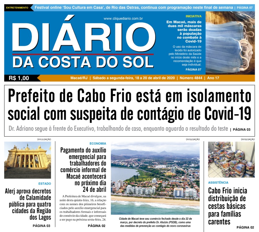 Edições Impressas Edição de Sáb a Seg, 18 a 20/04/2020 nº 4844 Publicado em 18/04/2020 - 07:00 Escrito por Fernando Vitor Notícias relacionadas: Seguinte Edição de terça e quarta-feira, 21 e 22/04/2020 nº 4845 Anterior Edição de sexta-feira, 17/04/2020 nº 4843 Fernando Vitor Notícias Recentes Cabo Frio7 horas atrás Agentes de Cabo Frio recebem novo treinamento técnico para atuar em casos de poluição sonora Cabo Frio7 horas atrás Homem procurado por latrocínio é detido por agentes em Cabo Frio Cabo Frio7 horas atrás Representante da Guarda Civil de Cabo Frio compete na etapa final ao lado de jovens atletas Polícia8 horas atrás Prefeito de Rio das Ostras volta de Brasília com esperança de novos investimentos Cidades8 horas atrás Campos publica 8ª convocação e chama 374 professores substitutos para a rede municipal Esporte8 horas atrás De Saquarema para o Brasileirão: Vasco troca gramado de São Januário Cidades8 horas atrás Quissamã inicia planejamento educacional para 2026 com foco em Educação Financeira Polícia11 horas atrás Mulher é presa na RJ-106, em Saquarema, com R$ 38 mil em drogas e arma Saúde12 horas atrás Silva Jardim tem aulão em alusão à campanha mundial do Novembro Azul Mobilidade12 horas atrás Mobilidade promove fiscalização para verificar situação de táxis em Rio das Ostras Clique Diário E. L. Mídia Editora Ltda CNPJ: 09.298.880/0001-07 Redação: Rua Tupinambás 122 Gloria – Macaé/RJ comercial@diariocs.com (22) 2765-7353 (22) 999253130 Mais lidas da semana Cultura13 horas atrás Adilson Lopes apresenta exposição “Trajetória” em Casimiro de Abreu Cidades3 dias atrás Servidores de Rio das Ostras participam de treinamento do Estado em Búzios Polícia3 dias atrás Farmácia é interditada e uma pessoa é presa em Rio das Ostras em operação da Polícia Federal Cidades2 dias atrás Vereadores de Macaé vão embarcar nesta quinta para participar da COP 30 em Belém