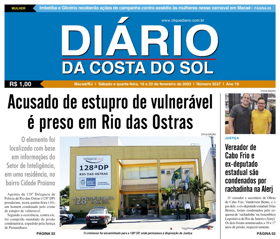 Edições Impressas Edição de sábado a quarta-feira 18 a 22/02/2023 nº 5537 Publicado em 18/02/2023 - 00:00 Escrito por Redação Notícias relacionadas: Seguinte Edição de quinta-feira 23/02/2023 nº 5538 Anterior Edição de sexta-feira 17/02/2023 nº 5536 Redação Notícias Recentes Cidades2 horas atrás Região serrana de Macaé recebe 1º X-Force Passeio de Quadriciclo e Aranha neste domingo (26) Polícia3 horas atrás Polícia apreende mais de meio quilo de drogas no Loteamento São João, em Rio das Ostras Saúde22 horas atrás Eventos esportivo e cultural reforça campanha do Outubro Rosa em Rio das Ostras nesse domingo, 26 Edições Impressas1 dia atrás Sábado a segunda-feira 25 a 27/10/2025 nº 6197 Cidades1 dia atrás Shopping Plaza Macaé oferece programação gratuita com feira de adoção e show de pagode neste fim de semana Cidades2 dias atrás 32º BPM completa 23 anos com solenidade de celebração e reconhecimento aos policiais Armação dos Búzios2 dias atrás Búzios celebra esporte e superação com XC RUN 2025 Araruama2 dias atrás Araruama promove saúde, lazer e cidadania em evento comunitário Arraial do cabo2 dias atrás Educação e sustentabilidade se encontram para jovens de Arraial do Cabo Cidades2 dias atrás Quissamã avança na reformulação do Currículo Municipal de Educação Clique Diário E. L. Mídia Editora Ltda CNPJ: 09.298.880/0001-07 Redação: Rua Tupinambás 122 Gloria – Macaé/RJ comercial@diariocs.com (22) 2765-7353 (22) 999253130 Mais lidas da semana Cultura6 dias atrás Silva Jardim anuncia shows gratuitos de samba e pagode para o fim de semana Cultura5 dias atrás Música, emoção e cores: Rodrigo Pontes apresenta show especial em Rio das Ostras Cabo Frio6 dias atrás Atletas de várias cidades se enfrentam em competição de Muay Thai em Cabo Frio Edições Impressas4 dias atrás Edição de quarta-feira 22/10/2025 nº 6195