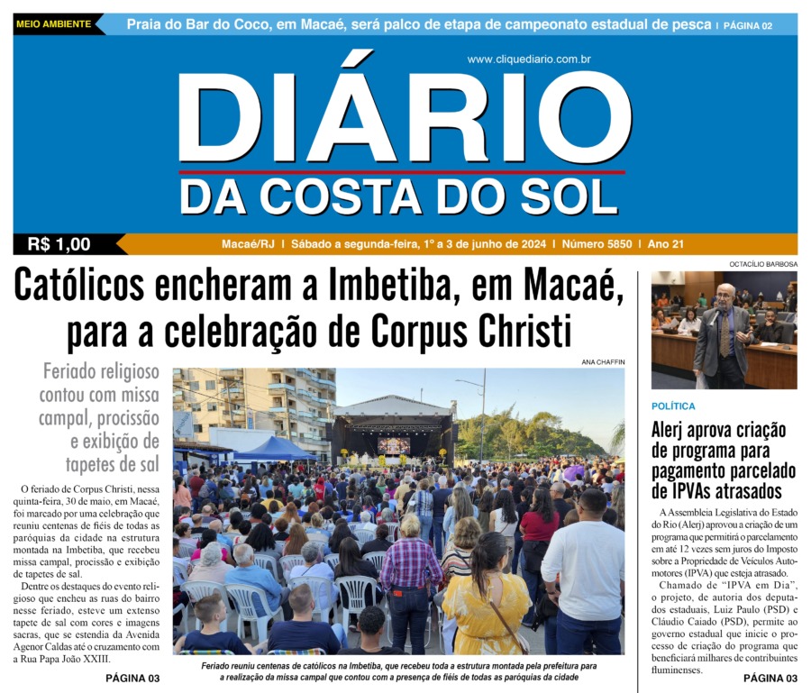 Edições Impressas Edição de sábado a segunda-feira 01 a 03/06/2024 nº 5850 Publicado em 01/06/2024 - 09:03 Escrito por Redação Notícias relacionadas: Seguinte Edição de terça-feira 04/06/2024 nº 5851 Anterior Edição de quinta e sexta-feira 30 e 31/05/2024 nº 5849 Redação Notícias Recentes Cabo Frio9 horas atrás Estudantes de Cabo Frio brilham em premiação do projeto CaptaAção Armação dos Búzios14 horas atrás Búzios Swim celebra esporte, natureza e turismo na Região dos Lagos Cabo Frio15 horas atrás Educação pública de Cabo Frio colhe frutos com conquistas em competições científicas Edições Impressas15 horas atrás Edição de sábado a segunda-feira 08 a 10/11/2025 nº 6208 Polícia15 horas atrás Moto sem placa é abandonada após fuga de suspeito em Macaé Polícia16 horas atrás Polícia Civil prende homem em flagrante por tráfico de drogas no Parque Aeroporto, em Macaé Iguaba1 dia atrás Menina de Iguaba Grande realiza sonho e conhece o príncipe William no Rio de Janeiro Arraial do cabo1 dia atrás Arraial do Cabo é exemplo de tranquilidade na Região dos Lagos, segundo dados do ISP Arraial do cabo1 dia atrás Festival em Arraial do Cabo promete recorde de público com mais de 15 mil pratos e 10 mil litros de chope Arraial do cabo1 dia atrás Oficina une saúde, cidadania e acolhimento em Arraial do Cabo Clique Diário E. L. Mídia Editora Ltda CNPJ: 09.298.880/0001-07 Redação: Rua Tupinambás 122 Gloria – Macaé/RJ comercial@diariocs.com (22) 2765-7353 (22) 999253130 Mais lidas da semana Arraial do cabo3 dias atrás Arraial do Cabo celebra 3ª edição do Festival de Frutos do Mar com entrada livre; Carol Biazin, Ramona Rox, Liah Soares e mais Turismo5 dias atrás Saquarema celebra reconhecimento de projeto pelo Ministério do Turismo Educação5 dias atrás Estudantes de Rio das Ostras são destaques em evento nacional da Educação Cidades4 dias atrás HFM ganha novo Pronto-Socorro moderno e ampliado em Campos