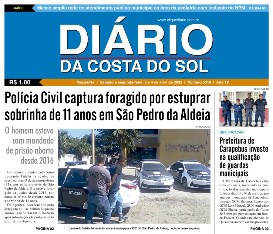 Edições Impressas Edição de sábado a segunda-feira 02 a 04/04/2022 nº 5318 Publicado em 01/04/2022 - 23:55 Escrito por Fernando Vitor Notícias relacionadas: Seguinte Edição de terça-feira 05/04/2022 nº 5319 Anterior Edição de sexta-feira 01/04/2022 nº 5317 Fernando Vitor Notícias Recentes Cidades31 minutos atrás Unimed Costa do Sol fortalece maternidade de alta complexidade e supera índices nacionais Polícia2 horas atrás Polícia Civil de Macaé prende suspeito de tentativa de latrocínio ocorrido em 2023 Cidades2 horas atrás Macaé intensifica campanha e anuncia Dia D para doação de sangue em 29 de novembro Lazer3 horas atrás Evento marca abertura do Natal em Silva Jardim nessa quarta-feira, 19 Polícia4 horas atrás Casal é preso com grande quantidade de drogas em ação da PM em Rio das Ostras Oportunidade4 horas atrás Banco de Empregos abre semana com 660 vagas para contração imediata em Rio das Ostras Cabo Frio24 horas atrás Cabo Frio antecipa a Black Friday com grandes marcas e atrações musicais Cidades1 dia atrás Procon de Rio das Ostras investiga denúncias de cobrança dupla na Enel Cidades1 dia atrás Macaé sediará o 8º Encontro Fluminense de Arborização Urbana em dezembro Cultura2 dias atrás Teatro de Rio das Ostras recebe 2 espetáculos de dança nesse fim de semana Clique Diário E. L. Mídia Editora Ltda CNPJ: 09.298.880/0001-07 Redação: Rua Tupinambás 122 Gloria – Macaé/RJ comercial@diariocs.com (22) 2765-7353 (22) 999253130 Mais lidas da semana Cultura3 dias atrás Adilson Lopes apresenta exposição “Trajetória” em Casimiro de Abreu Polícia5 dias atrás Farmácia é interditada e uma pessoa é presa em Rio das Ostras em operação da Polícia Federal Cidades6 dias atrás Servidores de Rio das Ostras participam de treinamento do Estado em Búzios Edições Impressas5 dias atrás Edição de quarta-feira 12/11/2025 nº 6210