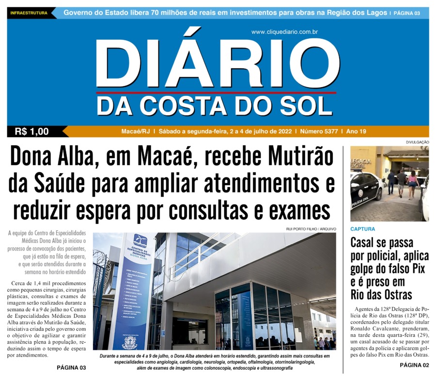 Edições Impressas Edição de sábado a segunda-feira 02 a 04/07/2022 nº 5377 Publicado em 02/07/2022 - 02:09 Escrito por Fernando Vitor Notícias relacionadas: Seguinte Edição de terça-feira 05/07/2022 nº 5378 Anterior Edição de sexta-feira 01/07/2022 nº 5376 Fernando Vitor Notícias Recentes Arraial do cabo10 horas atrás Educação de Arraial do Cabo orienta responsáveis sobre rematrícula para o próximo ano Cabo Frio10 horas atrás Evento comercial mais aguardado de Cabo Frio atinge 100% de estandes vendidos Saúde10 horas atrás Rio das Ostras comemora melhorias no atendimento da saúde municipal Cabo Frio10 horas atrás Nova exposição no Palácio das Águias recebe homenagem da cultura negra em Cabo Frio com 44 obras Arraial do cabo10 horas atrás A FIPAC em Arraial do Cabo alerta operadores náuticos: regularizem suas embarcações Comércio11 horas atrás Sindicomércio anuncia abertura do Natal Sesc 2025 em Rio das Ostras e Casimiro de Abreu Polícia11 horas atrás Polícia apreende drogas no Lagomar após varredura motivada por denúncia Polícia11 horas atrás Operação do GAT do 32º BPM apreende drogas, dinheiro e moto sem placa na Favela da Linha Desenvolvimento12 horas atrás Silva Jardim realiza audiência pública de revisão do seu Plano de Saneamento Básico Arraial do cabo13 horas atrás O poder da natureza e da memória em telas na mostra de Fransciscone Araújo em Arraial do Cabo Clique Diário E. L. Mídia Editora Ltda CNPJ: 09.298.880/0001-07 Redação: Rua Tupinambás 122 Gloria – Macaé/RJ comercial@diariocs.com (22) 2765-7353 (22) 999253130 Mais lidas da semana Cultura5 dias atrás Adilson Lopes apresenta exposição “Trajetória” em Casimiro de Abreu Polícia7 dias atrás Farmácia é interditada e uma pessoa é presa em Rio das Ostras em operação da Polícia Federal Meio Ambiente1 dia atrás Lagoa de Iriry, em Rio das Ostras, recebe nova sinalização focada em sustentabilidade Cidades1 dia atrás Macaé registra avanço na coleta seletiva porta a porta e recolhe mais de 2 toneladas em 45 dias