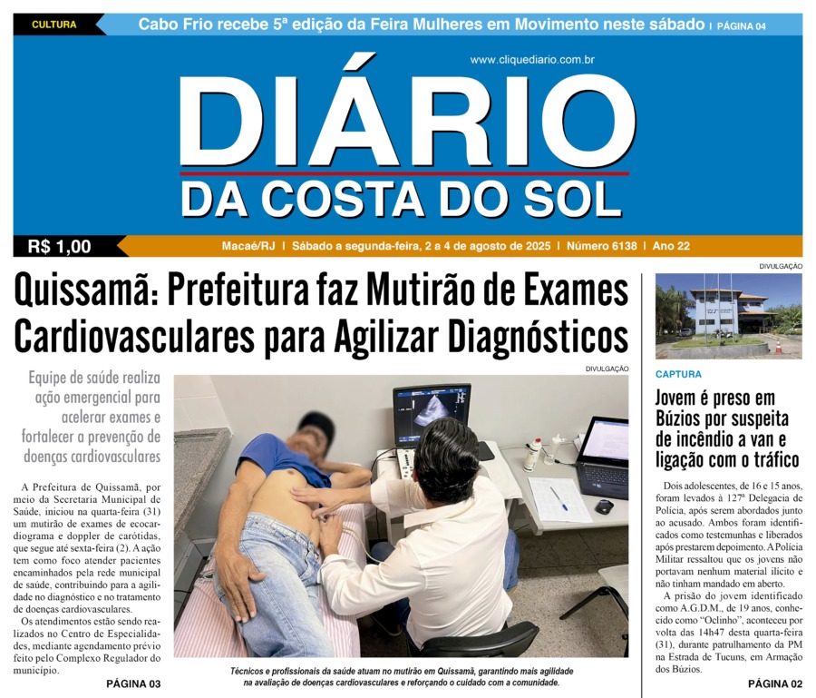 Edições Impressas Edição de sábado a segunda-feira 02 a 04/08/2025 nº 6138 Publicado em 02/08/2025 - 08:30 Escrito por Redação Notícias relacionadas: Seguinte Edição de terça-feira 05/08/2025 nº 6139 Anterior Edição de sexta-feira 01/08/2025 nº 6137 Redação Notícias Recentes Cidades15 horas atrás 32º BPM completa 23 anos com solenidade de celebração e reconhecimento aos policiais Armação dos Búzios15 horas atrás Búzios celebra esporte e superação com XC RUN 2025 Araruama15 horas atrás Araruama promove saúde, lazer e cidadania em evento comunitário Arraial do cabo15 horas atrás Educação e sustentabilidade se encontram para jovens de Arraial do Cabo Cidades15 horas atrás Quissamã avança na reformulação do Currículo Municipal de Educação Arraial do cabo15 horas atrás PIPE estimula presença e desempenho de alunos da rede pública de Arraial em programa estudantil Cabo Frio15 horas atrás Prefeitura de Cabo Frio prepara espaço para visitação no Dia de Finados Polícia15 horas atrás Dois homens são presos após furto a residência em Campos Cabo Frio15 horas atrás Câmara de Cabo Frio recebe debate sobre finanças municipais Cabo Frio15 horas atrás Projeto Mar Sem Lixo promove mostra ambiental com apoio da Secretaria de Meio Ambiente em Cabo Frio Clique Diário E. L. Mídia Editora Ltda CNPJ: 09.298.880/0001-07 Redação: Rua Tupinambás 122 Gloria – Macaé/RJ comercial@diariocs.com (22) 2765-7353 (22) 999253130 Mais lidas da semana Cultura5 dias atrás Silva Jardim anuncia shows gratuitos de samba e pagode para o fim de semana Cabo Frio5 dias atrás Serviços essenciais permanecem ativos durante ponto facultativo em Cabo Frio Cabo Frio5 dias atrás Atletas de várias cidades se enfrentam em competição de Muay Thai em Cabo Frio Polícia5 dias atrás Policiais da PRF salvam bebê engasgado na BR-101, em Campos