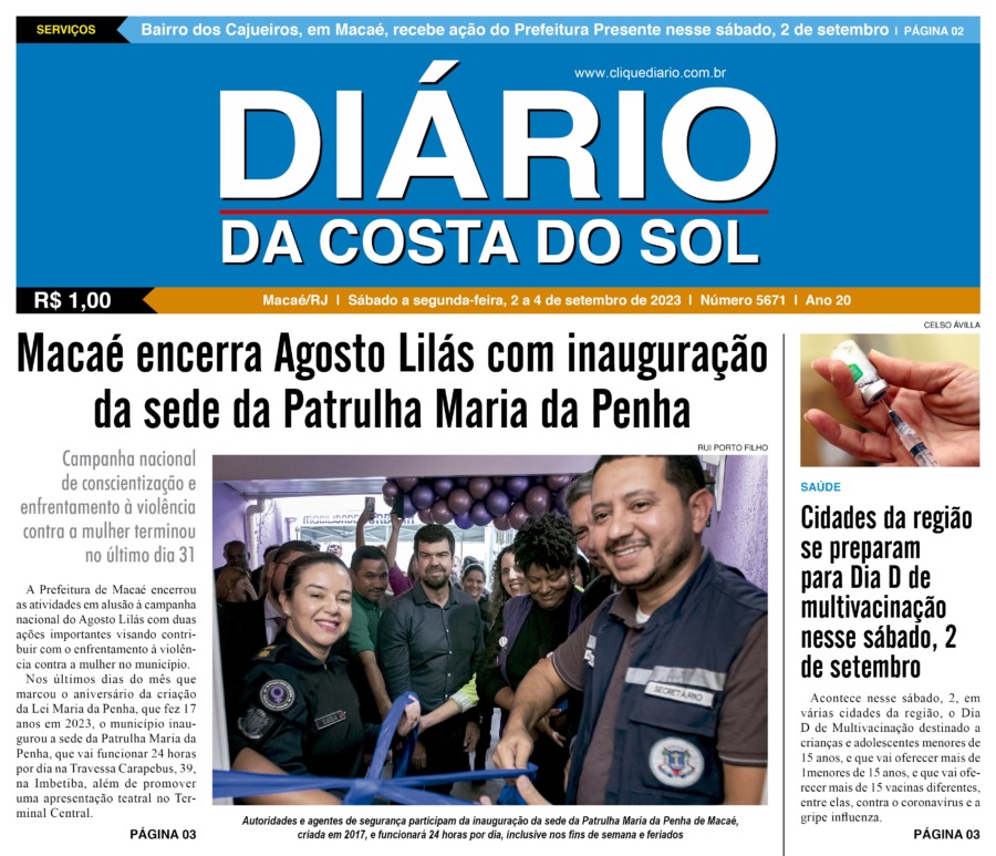 Edições Impressas Edição de sábado a segunda-feira 02 a 04/09/2023 nº 5671 Publicado em 01/09/2023 - 23:55 Escrito por Redação Notícias relacionadas: Seguinte Edição de terça-feira 05/09/2023 nº 5672 Anterior Edição de sexta-feira 01/09/2023 nº 5670 Redação Notícias Recentes Cabo Frio18 horas atrás Estudantes de Cabo Frio brilham em premiação do projeto CaptaAção Armação dos Búzios23 horas atrás Búzios Swim celebra esporte, natureza e turismo na Região dos Lagos Cabo Frio1 dia atrás Educação pública de Cabo Frio colhe frutos com conquistas em competições científicas Edições Impressas1 dia atrás Edição de sábado a segunda-feira 08 a 10/11/2025 nº 6208 Polícia1 dia atrás Moto sem placa é abandonada após fuga de suspeito em Macaé Polícia1 dia atrás Polícia Civil prende homem em flagrante por tráfico de drogas no Parque Aeroporto, em Macaé Iguaba2 dias atrás Menina de Iguaba Grande realiza sonho e conhece o príncipe William no Rio de Janeiro Arraial do cabo2 dias atrás Arraial do Cabo é exemplo de tranquilidade na Região dos Lagos, segundo dados do ISP Arraial do cabo2 dias atrás Festival em Arraial do Cabo promete recorde de público com mais de 15 mil pratos e 10 mil litros de chope Arraial do cabo2 dias atrás Oficina une saúde, cidadania e acolhimento em Arraial do Cabo Clique Diário E. L. Mídia Editora Ltda CNPJ: 09.298.880/0001-07 Redação: Rua Tupinambás 122 Gloria – Macaé/RJ comercial@diariocs.com (22) 2765-7353 (22) 999253130 Mais lidas da semana Arraial do cabo3 dias atrás Arraial do Cabo celebra 3ª edição do Festival de Frutos do Mar com entrada livre; Carol Biazin, Ramona Rox, Liah Soares e mais Meio Ambiente4 dias atrás Programa do governo estadual promove limpeza de rio no Âncora, em Rio das Ostras Meio Ambiente3 dias atrás Ações do Programa Limpa Rio seguem em vários pontos de Rio das Ostras Turismo6 dias atrás Saquarema celebra reconhecimento de projeto pelo Ministério do Turismo