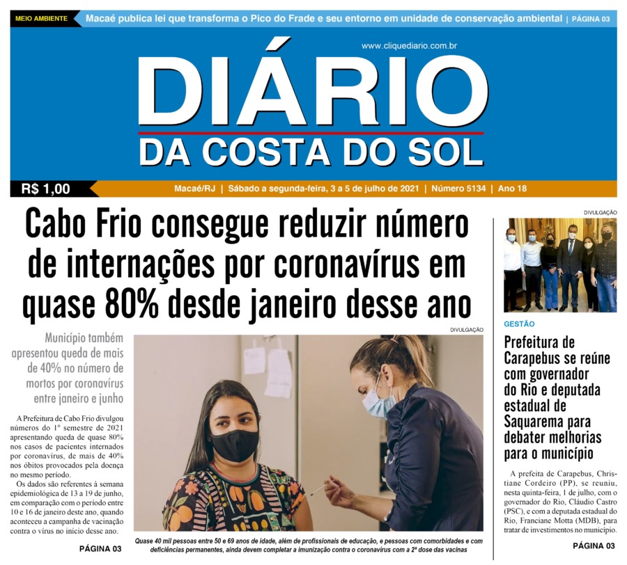 Edições Impressas Edição de sábado a segunda-feira 03 a 05/07/2021 nº 5134 Publicado em 03/07/2021 - 06:59 Escrito por Fernando Vitor Notícias relacionadas: Seguinte Edição de terça-feira 06/07/2021 n° 5135 Anterior Edição de sexta-feira 02/07/2021 n° 5133 Fernando Vitor Notícias Recentes Cabo Frio16 horas atrás Cabo Frio antecipa a Black Friday com grandes marcas e atrações musicais Cidades19 horas atrás Procon de Rio das Ostras investiga denúncias de cobrança dupla na Enel Cidades22 horas atrás Macaé sediará o 8º Encontro Fluminense de Arborização Urbana em dezembro Cultura2 dias atrás Teatro de Rio das Ostras recebe 2 espetáculos de dança nesse fim de semana Arraial do cabo2 dias atrás FIPAC oferece serviços de saúde e prevenção ao câncer de próstata em Arraial do Cabo Arraial do cabo2 dias atrás Resultado preliminar do concurso de Arraial já está no ar pelo IBAM Edições Impressas2 dias atrás Edição de sábado a segunda-feira 15 a 17/11/2025 nº 6213 Cidades2 dias atrás Shopping Plaza Macaé inicia programação de Natal neste fim de semana Cabo Frio2 dias atrás Disputa em dobro marca encerramento em Cabo Frio do circuito de surf Cabo Frio3 dias atrás Agentes de Cabo Frio recebem novo treinamento técnico para atuar em casos de poluição sonora Clique Diário E. L. Mídia Editora Ltda CNPJ: 09.298.880/0001-07 Redação: Rua Tupinambás 122 Gloria – Macaé/RJ comercial@diariocs.com (22) 2765-7353 (22) 999253130 Mais lidas da semana Cultura3 dias atrás Adilson Lopes apresenta exposição “Trajetória” em Casimiro de Abreu Cidades6 dias atrás Servidores de Rio das Ostras participam de treinamento do Estado em Búzios Polícia5 dias atrás Farmácia é interditada e uma pessoa é presa em Rio das Ostras em operação da Polícia Federal Esporte3 dias atrás De Saquarema para o Brasileirão: Vasco troca gramado de São Januário