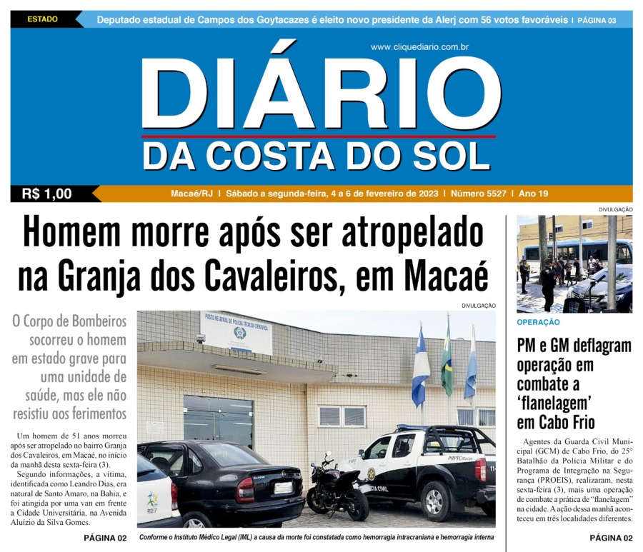 Edições Impressas Edição de sábado a segunda-feira 04 a 06/02/2023 nº 5527 Publicado em 04/02/2023 - 00:00 Escrito por Redação Notícias relacionadas: Seguinte Edição de terça-feira 07/02/2023 nº 5528 Anterior Edição de sexta-feira 03/02/2023 nº 5526 Redação Notícias Recentes Cabo Frio9 horas atrás Ação conjunta em Cabo Frio testa resposta rápida a incêndio em embarcação Cabo Frio9 horas atrás Bombeiros socorrem vítimas de colisão entre carro e motocicleta em Cabo Frio Cabo Frio9 horas atrás Cabo Frio reforça importância da prevenção com evento especial para servidoras da Comsercaf Polícia9 horas atrás Polícia Civil e Rio+ promovem operação contra furto de água em Rio das Ostras Arraial do cabo10 horas atrás Prefeitura de Arraial atualiza cadastro de famílias em área de preservação no Caiçara Arraial do cabo10 horas atrás Vistoria do Ipem facilita regularização de taxistas em Arraial do Cabo Cabo Frio10 horas atrás Biblioteca de Cabo Frio promove celebração artística e literária em homenagem aos poetas Cabo Frio10 horas atrás Canoa havaiana leva mensagem de coragem e prevenção pelo Canal do Itajuru, Cabo Frio Cabo Frio10 horas atrás Sede da Guarda Municipal de Cabo Frio vira espaço de acolhimento e saúde para mulheres Polícia10 horas atrás 32º BPM realizou 12 prisões em cidades da região em 24 horas Clique Diário E. L. Mídia Editora Ltda CNPJ: 09.298.880/0001-07 Redação: Rua Tupinambás 122 Gloria – Macaé/RJ comercial@diariocs.com (22) 2765-7353 (22) 999253130 Mais lidas da semana Cultura2 dias atrás Silva Jardim anuncia shows gratuitos de samba e pagode para o fim de semana Edições Impressas6 dias atrás Edição de sexta-feira 17/10/2025 nº 6192 Cultura2 dias atrás Música, emoção e cores: Rodrigo Pontes apresenta show especial em Rio das Ostras Polícia2 dias atrás Policiais da PRF salvam bebê engasgado na BR-101, em Campos