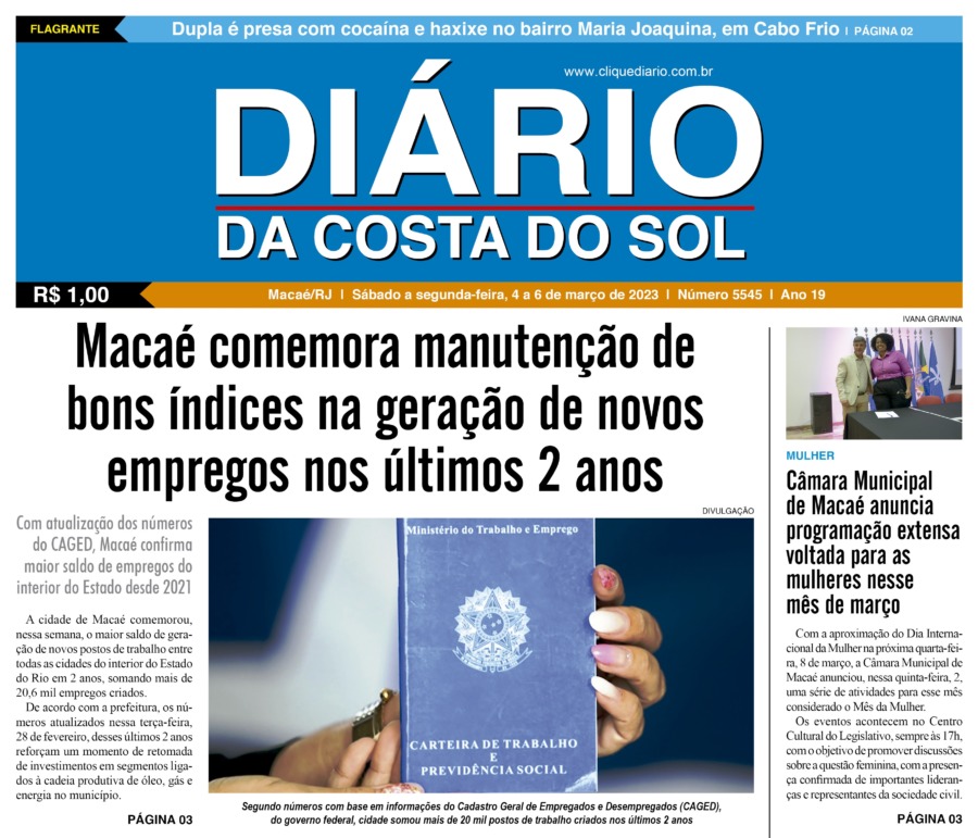 Edições Impressas Edição de sábado a segunda-feira 04 a 06/03/2023 nº 5545 Publicado em 03/03/2023 - 23:55 Escrito por Redação Notícias relacionadas: Seguinte Edição de terça-feira 07/03/2023 nº 5546 Anterior Edição de sexta-feira 03/03/2023 nº 5544 Redação Notícias Recentes Cabo Frio22 horas atrás Vendas de Natal em Cabo Frio mostram contrastes entre setores e consumidores Cidades23 horas atrás Bondinho da Praia volta a circular em Macaé a partir deste sábado (27) Edições Impressas2 dias atrás Edição de quarta a segunda-feira 24 a 29/12/2025 nº 6239 Arraial do cabo2 dias atrás Arraial do Cabo amplia educação ambiental com esculturas marinhas itinerantes Cidades2 dias atrás Macaé anuncia entregas de obras de infraestrutura e educação na próxima semana Cabo Frio3 dias atrás Cabo Frio amplia segurança nas travessias da Rodovia Amaral Peixoto Cabo Frio3 dias atrás Cabo Frio intensifica segurança da navegação durante a alta temporada Cidades3 dias atrás Saquarema lidera gestão ambiental na Região dos Lagos, aponta ICMS Ecológico 2025 Cidades3 dias atrás Mulher tem moto roubada durante assalto na BR-101, em Campos Armação dos Búzios3 dias atrás Búzios inicia verão com hotéis quase lotados e economia aquecida Clique Diário E. L. Mídia Editora Ltda CNPJ: 09.298.880/0001-07 Redação: Rua Tupinambás 122 Gloria – Macaé/RJ comercial@diariocs.com (22) 2765-7353 (22) 999253130 Mais lidas da semana Cabo Frio7 dias atrás Procon de Cabo Frio reforça parceria com a defesa do consumidor do estado Polícia4 dias atrás PM prende homem por tráfico de drogas no bairro Aeroporto Arraial do cabo7 dias atrás Instituto de previdência cabista publica resultado definitivo de concurso em Arraial do Cabo Cidades7 dias atrás Macaé amplia coleta seletiva com novos Ecopontos em funcionamento