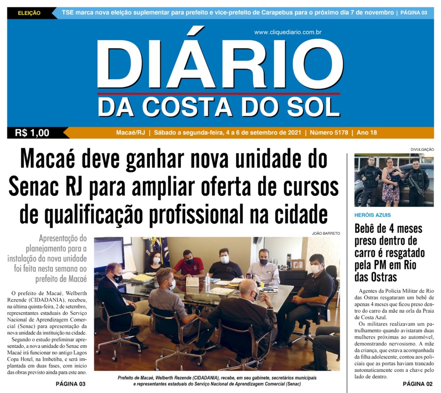 Edições Impressas Edição de sábado a segunda-feira 04 a 06/09/2021 n° 5178 Publicado em 04/09/2021 - 00:01 Escrito por Fernando Vitor Notícias relacionadas: Seguinte Edição de terça e quarta-feira 07 e 08/09/2021 n° 5179 Anterior Edição de sexta-feira 03/09/2021 n° 5177 Fernando Vitor Notícias Recentes Armação dos Búzios13 horas atrás Búzios atinge 80% de ocupação no feriado Cabo Frio14 horas atrás Cabo Frio prepara esquema especial de segurança nas praias e áreas de lazer Cabo Frio14 horas atrás Cabo Frio realiza ações de proteção a fauna após aparecimento de animais em bairros Cabo Frio14 horas atrás Cabo Frio reúne especialistas em evento do programa “Vim Cuidar de Você” Desenvolvimento14 horas atrás Rio das Ostras estreita relações com a Rede Petro BC de olho em eventos do setor de energia em 2026 Cabo Frio14 horas atrás Aula-passeio apresenta riqueza cultural e ambiental de Cabo Frio na Fazenda Campos Novos Cabo Frio14 horas atrás Cabo Frio suspende expediente em órgãos públicos nesta sexta Cidades14 horas atrás Macaé terá Dia do Futebol Feminino e programa para valorização da mulher rural Arraial do cabo14 horas atrás Carreta científica desembarca em Arraial do Cabo com programação gratuita Polícia15 horas atrás Polícia Civil prende liderança do ADA no bairro Fronteira em Macaé Clique Diário E. L. Mídia Editora Ltda CNPJ: 09.298.880/0001-07 Redação: Rua Tupinambás 122 Gloria – Macaé/RJ comercial@diariocs.com (22) 2765-7353 (22) 999253130 Mais lidas da semana Cultura6 dias atrás Adilson Lopes apresenta exposição “Trajetória” em Casimiro de Abreu Desenvolvimento14 horas atrás Rio das Ostras estreita relações com a Rede Petro BC de olho em eventos do setor de energia em 2026 Cidades3 dias atrás Macaé registra avanço na coleta seletiva porta a porta e recolhe mais de 2 toneladas em 45 dias Mobilidade6 dias atrás Mobilidade promove fiscalização para verificar situação de táxis em Rio das Ostras