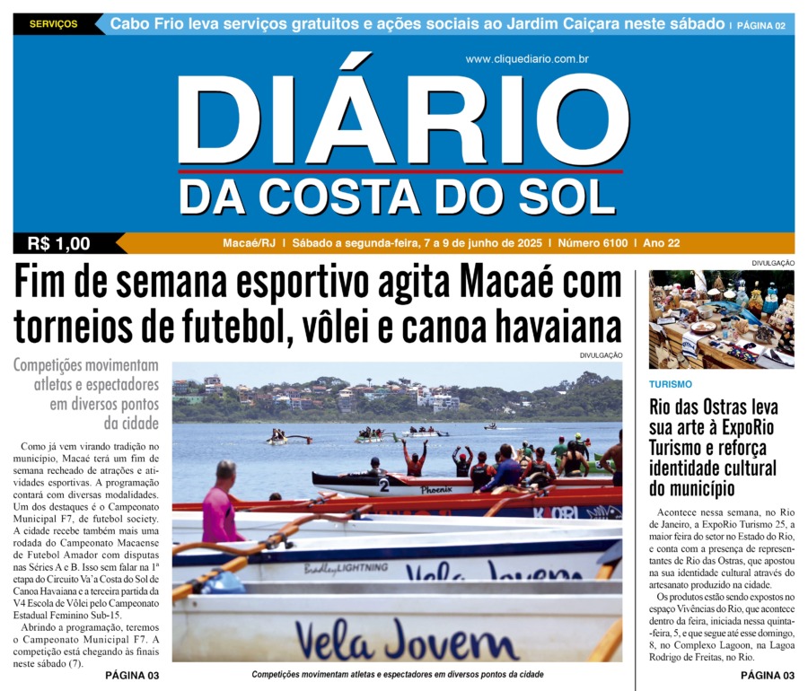 Edições Impressas Edição de sábado a segunda-feira 07 a 09/06/2025 nº 6100 Publicado em 07/06/2025 - 10:00 Escrito por Redação Notícias relacionadas: Seguinte Edição de terça-feira 10/06/2025 nº 6101 Anterior Edição de sexta-feira 06/06/2025 nº 6099 Redação Notícias Recentes Cidades5 minutos atrás Silva Jardim promove solenidade para entrega de Plano de Contingências 2025-2026 Segurança Pública1 hora atrás Prefeito de Rio das Ostras se manifesta após mais uma ação da PM contra barricadas do tráfico Polícia2 horas atrás Homem é detido por envolvimento com o tráfico durante patrulhamento na Nova Holanda, em Macaé Polícia2 horas atrás Polícia apreende grande quantidade de drogas durante operação no Nova Esperança em Macaé Polícia2 horas atrás Polícia recupera carro roubado antes mesmo do registro da ocorrência em Rio das Ostras Edições Impressas2 horas atrás Edição de quinta-feira 13/11/2025 nº 6211 Cidades2 horas atrás Macaé é finalista no Festival Internacional de Cinema Cristão com “A Paixão de Cristo” Cabo Frio19 horas atrás Reforma marca nova fase para o esporte cabo-friense e aniversário da cidade Arraial do cabo19 horas atrás Fórum de Arraial propõe novo modelo de desenvolvimento baseado nos 3Ds; Desvincular, Descarbonizar e Descontaminar Saúde19 horas atrás Saúde de Rio das Ostras promove mutirão de cirurgia pediátrica nessa semana Clique Diário E. L. Mídia Editora Ltda CNPJ: 09.298.880/0001-07 Redação: Rua Tupinambás 122 Gloria – Macaé/RJ comercial@diariocs.com (22) 2765-7353 (22) 999253130 Mais lidas da semana Arraial do cabo7 dias atrás Arraial do Cabo celebra 3ª edição do Festival de Frutos do Mar com entrada livre; Carol Biazin, Ramona Rox, Liah Soares e mais Meio Ambiente7 dias atrás Ações do Programa Limpa Rio seguem em vários pontos de Rio das Ostras Cidades2 dias atrás Servidores de Rio das Ostras participam de treinamento do Estado em Búzios Diversão7 dias atrás Praia do Abricó, em Rio das Ostras, sedia evento fitness nesse fim de semana