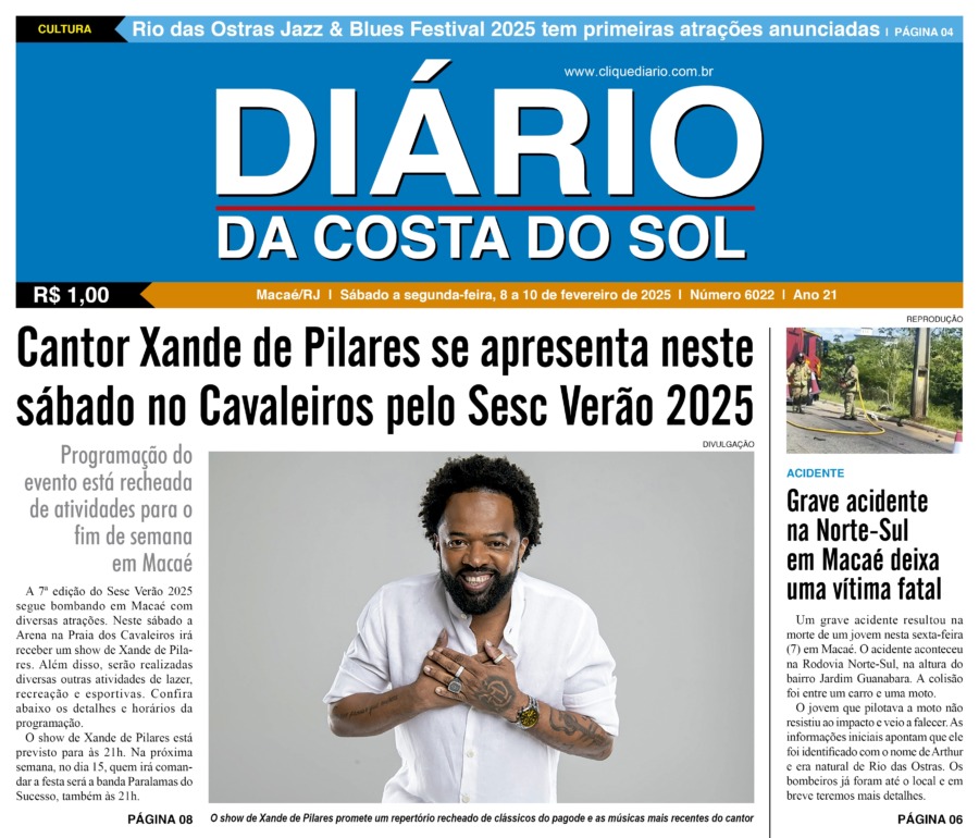 Edições Impressas Edição de Sábado a Segunda-feira 08 a 10/02/2025 nº 6022 Publicado em 08/02/2025 - 07:37 Escrito por Redação Notícias relacionadas: Seguinte Edição de terça-feira 11/02/2025 nº 6023 Anterior Edição de sexta-feira 07/02/2025 nº 6021 Redação Notícias Recentes Cabo Frio10 horas atrás Reforma marca nova fase para o esporte cabo-friense e aniversário da cidade Arraial do cabo10 horas atrás Fórum de Arraial propõe novo modelo de desenvolvimento baseado nos 3Ds; Desvincular, Descarbonizar e Descontaminar Saúde11 horas atrás Saúde de Rio das Ostras promove mutirão de cirurgia pediátrica nessa semana Cidades11 horas atrás Guarda Ambiental resgata jiboia de três metros em área urbana de Macaé Cidades11 horas atrás Vereadores de Macaé vão embarcar nesta quinta para participar da COP 30 em Belém Arraial do cabo11 horas atrás Parceria com a PF fortalece preparo técnico da Segurança Pública de Arraial do Cabo Arraial do cabo11 horas atrás Iniciativa busca compensar emissões de carbono da frota de Arraial Cidades12 horas atrás Parceria com o Estado reforça prevenção de enchentes em Rio das Ostras há 39 dias do verão Desenvolvimento13 horas atrás Arteris vence novo leilão da BR-101 e mantém operação da via até 2047 Cidades13 horas atrás Prefeitura de Quissamã abre prazo para solicitação de isenção do IPTU 2026 e 2027 Clique Diário E. L. Mídia Editora Ltda CNPJ: 09.298.880/0001-07 Redação: Rua Tupinambás 122 Gloria – Macaé/RJ comercial@diariocs.com (22) 2765-7353 (22) 999253130 Mais lidas da semana Arraial do cabo7 dias atrás Arraial do Cabo celebra 3ª edição do Festival de Frutos do Mar com entrada livre; Carol Biazin, Ramona Rox, Liah Soares e mais Meio Ambiente6 dias atrás Ações do Programa Limpa Rio seguem em vários pontos de Rio das Ostras Cabo Frio7 dias atrás Música, poesia e memória celebram os 410 anos de Cabo Frio Polícia18 horas atrás Farmácia é interditada e uma pessoa é presa em Rio das Ostras em operação da Polícia Federal