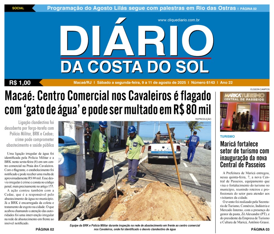 Edições Impressas Edição de sábado a segunda-feira 09 a 11/08/2025 nº 6143 Publicado em 09/08/2025 - 08:52 Escrito por Redação Notícias relacionadas: Seguinte Edição de terça-feira 12/08/2025 nº 6144 Anterior Edição de sexta-feira 08/08/2025 nº 6142 Redação Notícias Recentes Cidades9 minutos atrás Quissamã abre pré-matrículas para o ano letivo de 2026 nesta terça-feira (11) Cidades16 minutos atrás Procon Macaé emite alerta para consumidores durante a Black Friday Polícia31 minutos atrás Homem é preso em Campos acusado de abusar de criança de 5 anos Cidades42 minutos atrás Prefeitura reforça importância de ações preventivas contra alagamentos em Rio das Ostras Cidades2 horas atrás Casa do Educador de Saquarema recebe audiência pública nessa quarta, 12 Polícia3 horas atrás Equipe da Guarda de Cabo Frio recupera pertences levados de carro estacionado Educação3 horas atrás Basquete, queimado, dama e xadrez marcam em Cabo Frio o fim dos Jogos Estudantis Municipais Emprego4 horas atrás Prefeitura de Cabo Frio investe em qualificação e sustentabilidade Polícia5 horas atrás Adolescente é detida em Maricá em ação que apreendeu grande quantidade de drogas Polícia6 horas atrás Polícia apreende drogas em caixa de energia de casa em Rio das Ostras Clique Diário E. L. Mídia Editora Ltda CNPJ: 09.298.880/0001-07 Redação: Rua Tupinambás 122 Gloria – Macaé/RJ comercial@diariocs.com (22) 2765-7353 (22) 999253130 Mais lidas da semana Arraial do cabo4 dias atrás Arraial do Cabo celebra 3ª edição do Festival de Frutos do Mar com entrada livre; Carol Biazin, Ramona Rox, Liah Soares e mais Educação6 dias atrás Estudantes de Rio das Ostras são destaques em evento nacional da Educação Meio Ambiente5 dias atrás Programa do governo estadual promove limpeza de rio no Âncora, em Rio das Ostras Meio Ambiente4 dias atrás Ações do Programa Limpa Rio seguem em vários pontos de Rio das Ostras