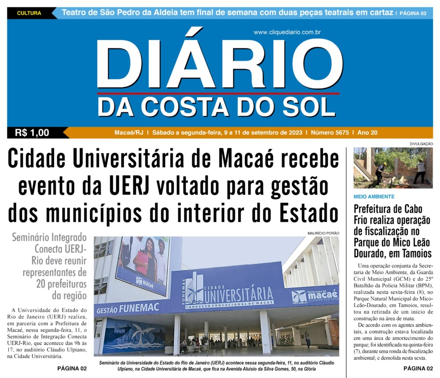 Edições Impressas Edição de sábado a segunda-feira 09 a 11/09/2023 nº 5675 Publicado em 08/09/2023 - 23:55 Escrito por Redação Notícias relacionadas: Seguinte Edição de terça-feira 12_09_2023 nº 5676 Anterior Edição de quinta e sexta-feira 07 e 08/09/2023 nº 5674 Redação Notícias Recentes Cabo Frio1 dia atrás Estudantes de Cabo Frio brilham em premiação do projeto CaptaAção Meio Ambiente1 dia atrás Cepro promove encontro para discutir avanços e desafios da justiça climática em Rio das Ostras Armação dos Búzios1 dia atrás Búzios Swim celebra esporte, natureza e turismo na Região dos Lagos Cabo Frio1 dia atrás Educação pública de Cabo Frio colhe frutos com conquistas em competições científicas Edições Impressas1 dia atrás Edição de sábado a segunda-feira 08 a 10/11/2025 nº 6208 Polícia1 dia atrás Moto sem placa é abandonada após fuga de suspeito em Macaé Polícia1 dia atrás Polícia Civil prende homem em flagrante por tráfico de drogas no Parque Aeroporto, em Macaé Iguaba2 dias atrás Menina de Iguaba Grande realiza sonho e conhece o príncipe William no Rio de Janeiro Arraial do cabo2 dias atrás Arraial do Cabo é exemplo de tranquilidade na Região dos Lagos, segundo dados do ISP Arraial do cabo2 dias atrás Festival em Arraial do Cabo promete recorde de público com mais de 15 mil pratos e 10 mil litros de chope Clique Diário E. L. Mídia Editora Ltda CNPJ: 09.298.880/0001-07 Redação: Rua Tupinambás 122 Gloria – Macaé/RJ comercial@diariocs.com (22) 2765-7353 (22) 999253130 Mais lidas da semana Arraial do cabo3 dias atrás Arraial do Cabo celebra 3ª edição do Festival de Frutos do Mar com entrada livre; Carol Biazin, Ramona Rox, Liah Soares e mais Meio Ambiente4 dias atrás Programa do governo estadual promove limpeza de rio no Âncora, em Rio das Ostras Meio Ambiente3 dias atrás Ações do Programa Limpa Rio seguem em vários pontos de Rio das Ostras Cidades5 dias atrás HFM ganha novo Pronto-Socorro moderno e ampliado em Campos