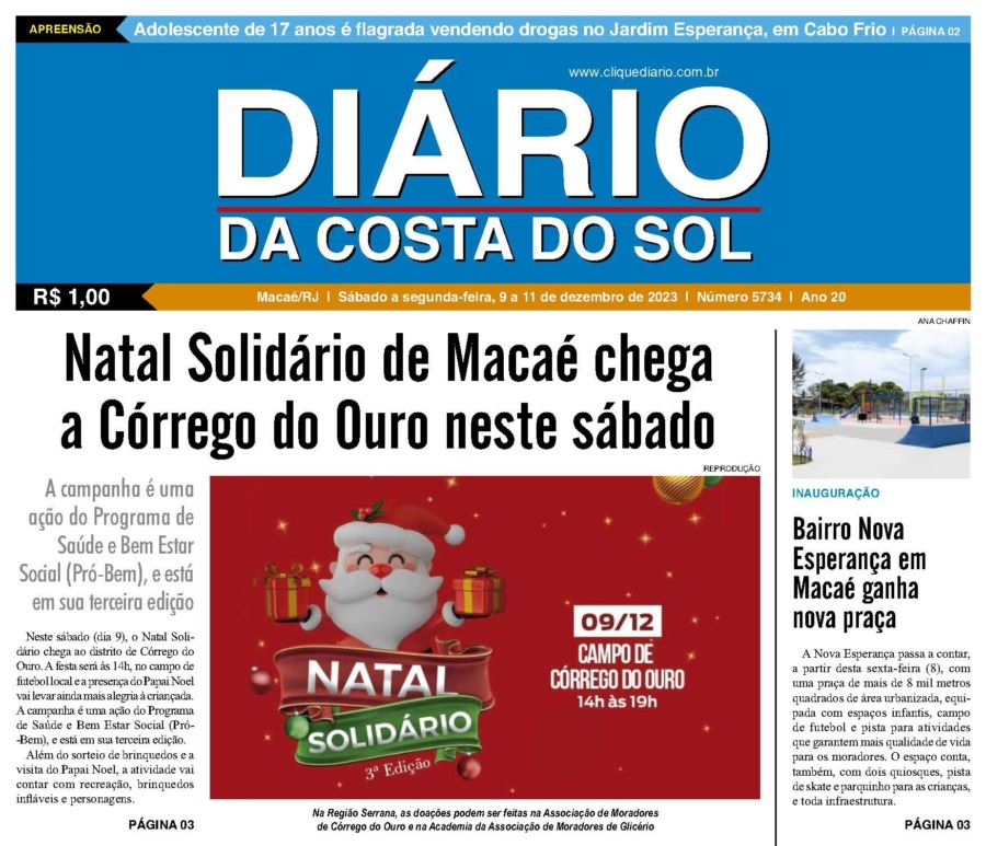 Edições Impressas Edição de sábado a segunda-feira 09 a 11/12/2023 nº 5734 Publicado em 09/12/2023 - 07:00 Escrito por Redação Notícias relacionadas: Seguinte Edição de terça-feira 12/12/2023 nº 5735 Anterior Edição de sexta-feira 08/12/2023 nº 5733 Redação Notícias Recentes Cidades10 horas atrás Macaé realizou 5ª Corrida e Caminhada Outubro Rosa Novembro Azul na orla da Imbetiba Cidades10 horas atrás Rio das Ostras autua Rio+ por mais um caso de vazamento de esgoto na cidade Cabo Frio10 horas atrás Ação da Prefeitura e AAMA leva reflexão sobre autocuidado e prevenção do câncer de mama em Cabo Frio Cidades11 horas atrás Casa do Servidor em Macaé ultrapassa 7 mil atendimentos em oito meses de funcionamento Polícia11 horas atrás Foragido da Justiça é preso pela PM na BR-101 em Campos Araruama11 horas atrás Prefeitura define plano de segurança integrado para a Expo Araruama Iguaba11 horas atrás Prefeitura de Iguaba Grande prepara nova turma de aprendizes para atuação em órgãos públicos Cabo Frio11 horas atrás Mostra de Dança movimenta Cabo Frio com apresentações, solidariedade e cultura local Cabo Frio11 horas atrás Cabo Frio dá início à formação obrigatória para ambulantes das praias Polícia11 horas atrás Homem é preso com rádios transmissores em depósito de Casimiro de Abreu Clique Diário E. L. Mídia Editora Ltda CNPJ: 09.298.880/0001-07 Redação: Rua Tupinambás 122 Gloria – Macaé/RJ comercial@diariocs.com (22) 2765-7353 (22) 999253130 Mais lidas da semana Cultura7 dias atrás Música, emoção e cores: Rodrigo Pontes apresenta show especial em Rio das Ostras Edições Impressas6 dias atrás Edição de quarta-feira 22/10/2025 nº 6195 Edições Impressas5 dias atrás Edição de quinta-feira 23/10/2025 nº 6196 Cidadania4 dias atrás Plano Diretor de Rio das Ostras é tema de fórum da sociedade civil nesse sábado, 25