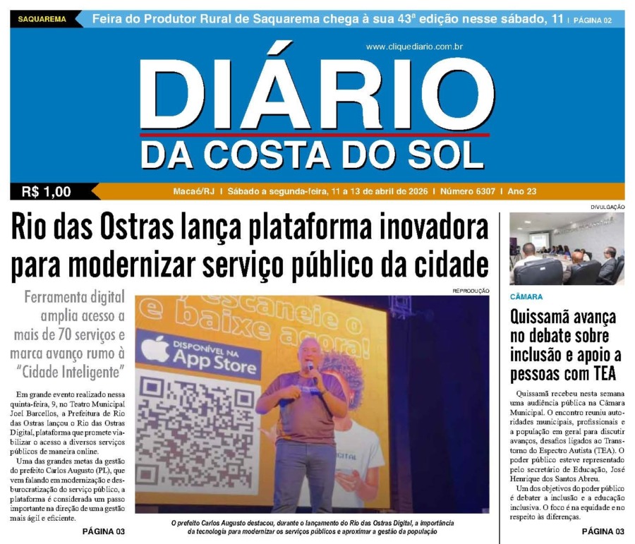 Edições Impressas Edição de sábado a segunda-feira 11 a 13/04/2026 nº 6307 Publicado em 11/04/2026 - 09:22 Escrito por Redação Notícias relacionadas: Anterior Edição de sexta-feira 10/04/2026 nº 6306 Redação Notícias Recentes Edições Impressas4 segundos atrás Edição de sábado a segunda-feira 11 a 13/04/2026 nº 6307 Cidades1 hora atrás Macaé promove agenda com esporte, saúde e lazer neste fim de semana Cabo Frio1 hora atrás Moradores denunciam esgoto deixado em calçada em Cabo Frio Clima2 horas atrás Sede do CEPRO recebe fórum para discutir impactos das chuvas em Rio das Ostras Cabo Frio16 horas atrás Nova configuração viária começa a valer no bairro Passagem nesta sexta-feira em Cabo Frio Cidades17 horas atrás Macaé ganha linha especial de ônibus para Carnaval fora de época Cidades17 horas atrás Rio das Ostras lança plataforma inovadora para modernizar serviço público da cidade Cidades17 horas atrás Quissamã avança no debate sobre inclusão e apoio a pessoas com TEA Cidades17 horas atrás Rio das Ostras promove ação de reforço de vacinação antirrábica nesse sábado, 11 Armação dos Búzios18 horas atrás Armação dos Búzios aposta no audiovisual para impulsionar turismo e economia Clique Diário E. L. Mídia Editora Ltda CNPJ: 09.298.880/0001-07 Redação: Rua Tupinambás 122 Gloria – Macaé/RJ comercial@diariocs.com (22) 2765-7353 (22) 999253130 Mais lidas da semana Polícia4 dias atrás Homem condenado por estupro é preso em Rio das Ostras em ação das polícias Militar e Federal Cidades2 dias atrás Quissamã investe na qualificação de profissionais da saúde municipal Cabo Frio16 horas atrás Nova configuração viária começa a valer no bairro Passagem nesta sexta-feira em Cabo Frio Cidades3 dias atrás Cursos gratuitos em Campos registram alta procura
