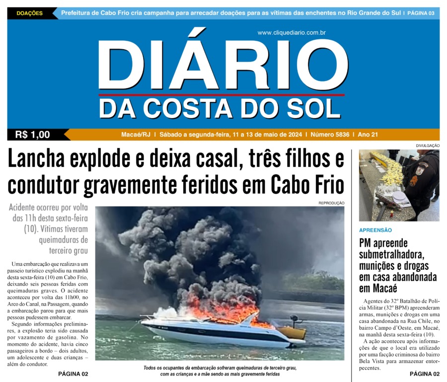 Edições Impressas Edição de sábado a segunda-feira 11 a 13/05/2024 nº 5836 Publicado em 11/05/2024 - 00:00 Escrito por Redação Notícias relacionadas: Seguinte Edição de Terça-feira 14/05/2024 nº 5837 Anterior Edição de sexta-feira 10/05/2024 nº 5835 Redação Notícias Recentes Polícia10 horas atrás Homem é morto a tiros no distrito de Travessão, em Campos São Pedro da Aldeia10 horas atrás Sequestro de idoso termina com resgate e prisões em São Pedro da Aldeia Araruama11 horas atrás Violência contra a mulher leva à prisão no distrito de Morro Grande em Araruama Cabo Frio11 horas atrás Cabo Frio antecipa logística da queima de fogos para o réveillon 2026 Cabo Frio12 horas atrás Cabo Frio aciona GOP em ocorrência envolvendo mulher e criança em São Bento Cidades14 horas atrás Rio das Ostras recebe ação social com serviços de higiene, saúde e orientação Cidades14 horas atrás Novo projeto da Praça do Jardim Guanabara promete mais lazer e qualidade de vida Cidades14 horas atrás 32º BPM intensifica fiscalização e apreende veículo em situação irregular em Rio das Ostras Cabo Frio2 dias atrás Vendas de Natal em Cabo Frio mostram contrastes entre setores e consumidores Cidades2 dias atrás Bondinho da Praia volta a circular em Macaé a partir deste sábado (27) Clique Diário E. L. Mídia Editora Ltda CNPJ: 09.298.880/0001-07 Redação: Rua Tupinambás 122 Gloria – Macaé/RJ comercial@diariocs.com (22) 2765-7353 (22) 999253130 Mais lidas da semana Cidades14 horas atrás Novo projeto da Praça do Jardim Guanabara promete mais lazer e qualidade de vida Polícia5 dias atrás PM prende homem por tráfico de drogas no bairro Aeroporto Cidades14 horas atrás 32º BPM intensifica fiscalização e apreende veículo em situação irregular em Rio das Ostras Cidades14 horas atrás Rio das Ostras recebe ação social com serviços de higiene, saúde e orientação