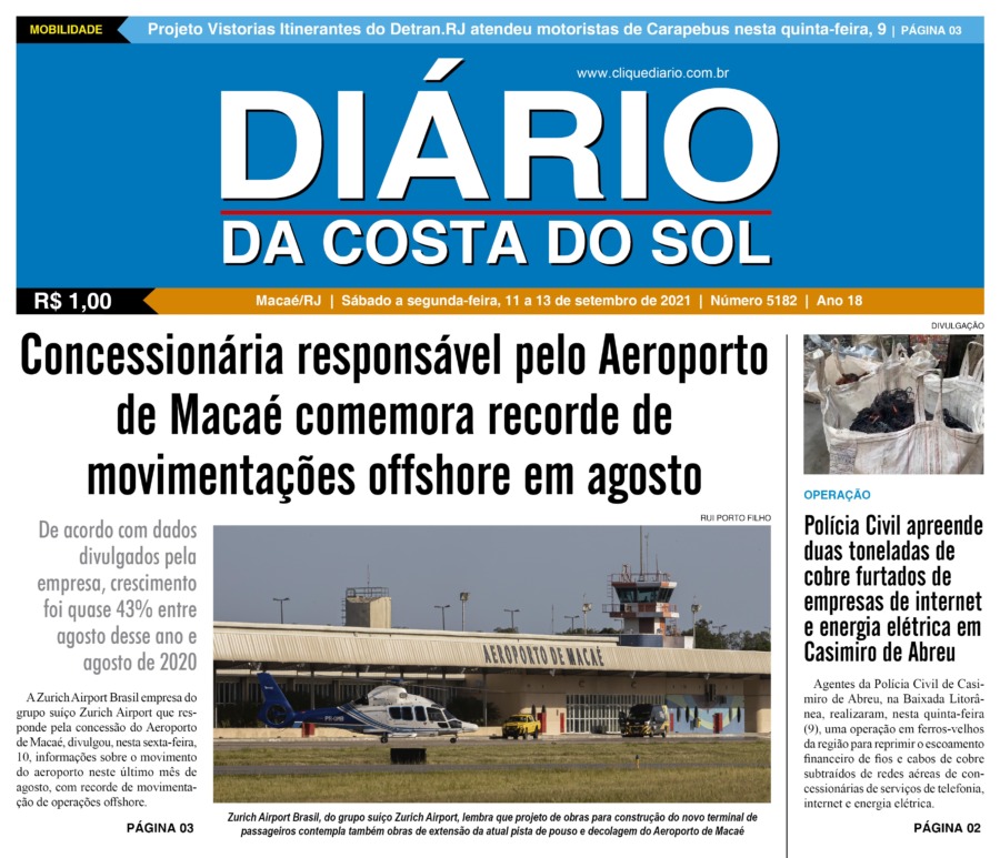 Edições Impressas Edição de Sábado a segunda-feira 11 a 13/09/2021 n° 5182 Publicado em 11/09/2021 - 15:08 Escrito por Fernando Vitor Notícias relacionadas: Seguinte Edição de terça-feira 14/09/2021 n° 5183 Anterior Edição de sexta-feira 10/09/2021 n° 5181 Fernando Vitor Notícias Recentes Cabo Frio6 horas atrás Cabo Frio antecipa a Black Friday com grandes marcas e atrações musicais Cidades10 horas atrás Procon de Rio das Ostras investiga denúncias de cobrança dupla na Enel Cidades12 horas atrás Macaé sediará o 8º Encontro Fluminense de Arborização Urbana em dezembro Cultura1 dia atrás Teatro de Rio das Ostras recebe 2 espetáculos de dança nesse fim de semana Arraial do cabo1 dia atrás FIPAC oferece serviços de saúde e prevenção ao câncer de próstata em Arraial do Cabo Arraial do cabo1 dia atrás Resultado preliminar do concurso de Arraial já está no ar pelo IBAM Edições Impressas1 dia atrás Edição de sábado a segunda-feira 15 a 17/11/2025 nº 6213 Cidades2 dias atrás Shopping Plaza Macaé inicia programação de Natal neste fim de semana Cabo Frio2 dias atrás Disputa em dobro marca encerramento em Cabo Frio do circuito de surf Cabo Frio2 dias atrás Agentes de Cabo Frio recebem novo treinamento técnico para atuar em casos de poluição sonora Clique Diário E. L. Mídia Editora Ltda CNPJ: 09.298.880/0001-07 Redação: Rua Tupinambás 122 Gloria – Macaé/RJ comercial@diariocs.com (22) 2765-7353 (22) 999253130 Mais lidas da semana Cultura2 dias atrás Adilson Lopes apresenta exposição “Trajetória” em Casimiro de Abreu Cidades5 dias atrás Servidores de Rio das Ostras participam de treinamento do Estado em Búzios Polícia4 dias atrás Farmácia é interditada e uma pessoa é presa em Rio das Ostras em operação da Polícia Federal Esporte2 dias atrás De Saquarema para o Brasileirão: Vasco troca gramado de São Januário