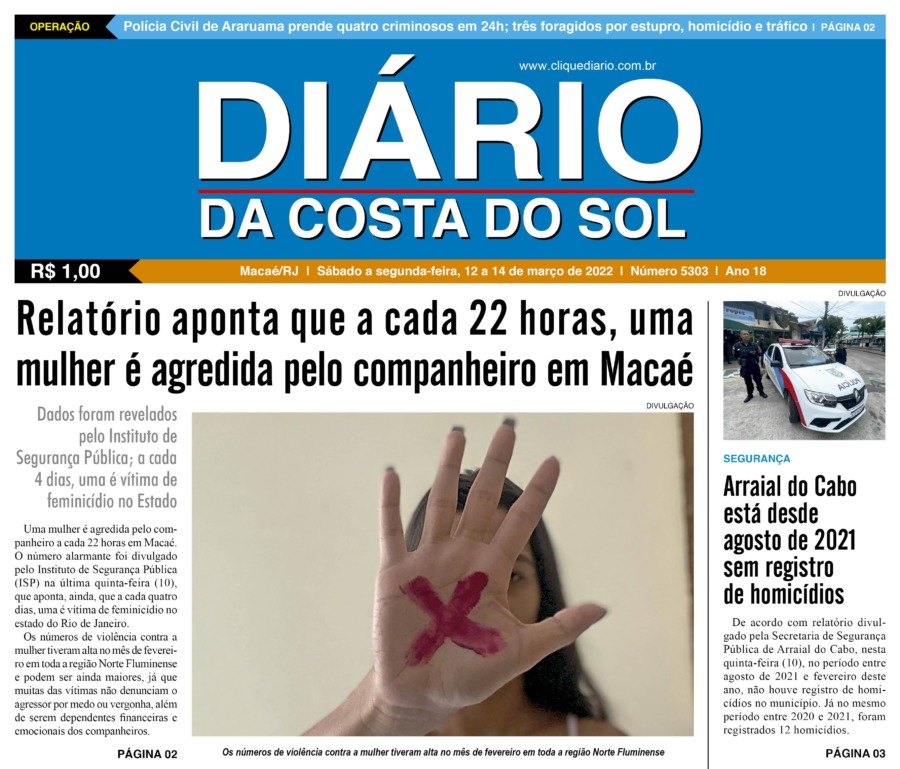 Edições Impressas Edição de sábado a segunda-feira 12 a 14/03/2022 nº 5303 Publicado em 11/03/2022 - 23:55 Escrito por Fernando Vitor Notícias relacionadas: Seguinte Edição de terça-feira 15/03/2022 nº 5304 Anterior Edição de sexta-feira 11/03/2022 nº 5302 Fernando Vitor Notícias Recentes Cultura2 horas atrás Moda e Prosa Caipira tem sua 6ª edição nessa quinta, 20, em Saquarema Comércio3 horas atrás Rio das Ostras tem 19ª edição de sua tradicional feira outlet nesse feriado Cidades3 horas atrás Macaé recebe 20ª edição do Prefeitura Presente no dia 25 de novembro Polícia4 horas atrás Denúncia anônima leva à prisão de duas mulheres por tráfico em Macaé Cidades4 horas atrás Caravana de Natal Coca-Cola passa por Rio das Ostras e Casimiro de Abreu nessa quinta, 20 Edições Impressas5 horas atrás Edição de quarta-feira 19/11/2025 nº 6215 Arraial do cabo21 horas atrás Educação de Arraial do Cabo orienta responsáveis sobre rematrícula para o próximo ano Cabo Frio21 horas atrás Evento comercial mais aguardado de Cabo Frio atinge 100% de estandes vendidos Saúde22 horas atrás Rio das Ostras comemora melhorias no atendimento da saúde municipal Cabo Frio22 horas atrás Nova exposição no Palácio das Águias recebe homenagem da cultura negra em Cabo Frio com 44 obras Clique Diário E. L. Mídia Editora Ltda CNPJ: 09.298.880/0001-07 Redação: Rua Tupinambás 122 Gloria – Macaé/RJ comercial@diariocs.com (22) 2765-7353 (22) 999253130 Mais lidas da semana Cultura5 dias atrás Adilson Lopes apresenta exposição “Trajetória” em Casimiro de Abreu Cidades2 dias atrás Macaé registra avanço na coleta seletiva porta a porta e recolhe mais de 2 toneladas em 45 dias Meio Ambiente2 dias atrás Lagoa de Iriry, em Rio das Ostras, recebe nova sinalização focada em sustentabilidade Mobilidade5 dias atrás Mobilidade promove fiscalização para verificar situação de táxis em Rio das Ostras